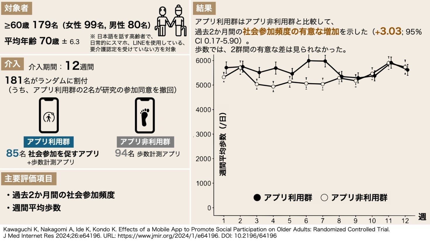 千葉大学予防医学センター 河口謙二郎特任助教、中込敦士准教授、近藤克則特任教授らの研究グループは、60歳以上の高齢者を対象に、高齢者の社会参加を促進するアプリの効果を検証するランダム化比較試験(注1)を実施しました。参加者は社会参加を促すアプリの利用群(87名)と非利用群(94名)にランダムに割り当てられ、介入群は12週間にわたってアプリを使用しました。
