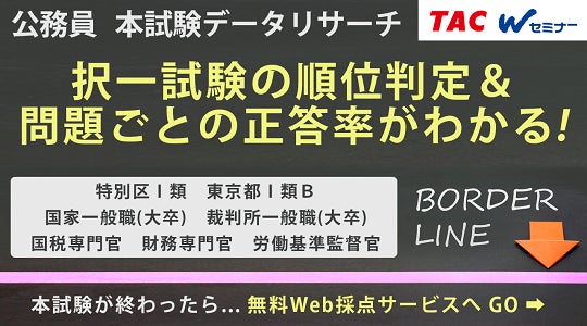 多くの受験生が参加するTACの本試験データリサーチによるデータ分析に、ぜひ積極的にご参加ください。TAC以外の受験生の方もご参加いただけます。また、ご登録いただいたくと、公務員試験「国家一般職[行政/大卒程度]採用試験」論文試験 TAC解答速報 をご覧いただけます。