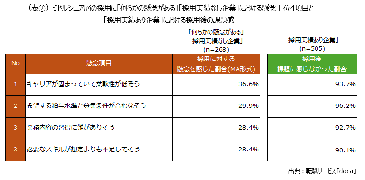 2024年度以降にミドルシニア層の採用実績がなく、今後も採用ニーズがない「採用実績なし企業」に対し、ミドルシニア層採用に対する懸念有無を聞いたところ、「何らかの懸念がある」と回答した割合は82.5%でした(図③)。「何らかの懸念がある」と回答した268人に具体的な懸念点を聞くと、上位4項目には「キャリアが固まっていて柔軟性が低そう」「希望する給与水準と募集条件が合わなそう」、同率で「業務内容の習得に難がありそう」「必要なスキルが想定よりも不足してそう」が挙げられました。(表②)