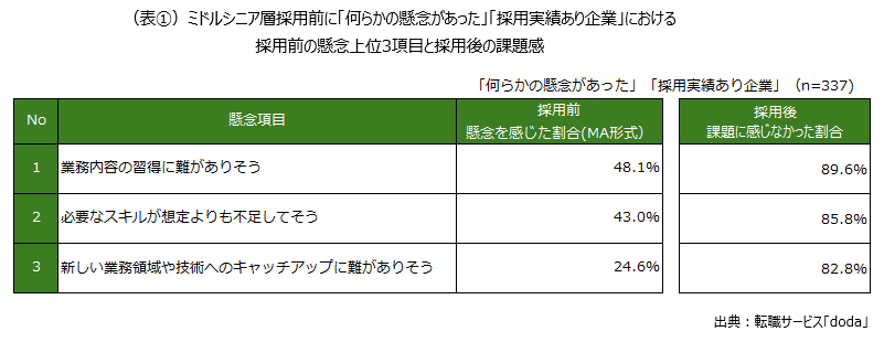 「採用実績あり企業」に対し、ミドルシニア層採用前の懸念の有無を聞いたところ、採用前に「何らかの懸念があった」割合は66.7%でした(図①)。「何らかの懸念があった」337人から具体的な懸念点について聞くと、「業務内容の習得に難がありそう」「必要なスキルが不足していそう」「新しい技術へのキャッチアップに難がありそう」が上位3項目に挙げられました(表①)。一方で、各項目について採用後の課題感の有無を聞いたところ「課題に感じなかった」と回答した割合はそれぞれ8割以上を占めました。つまり、採用前に「何らかの懸念があった」採用担当者の8割以上は、上位3項目の懸念に対して採用後に課題を感じておらず、不安は杞憂であったことが伺えます。