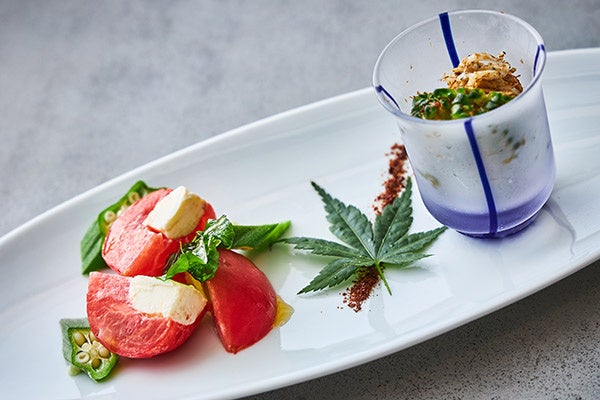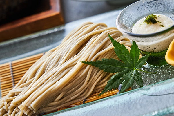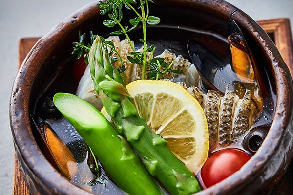 前菜はトマト燻製チーズ射込みと旬のゴーヤーをしらすとおかかえで和えたお酒のあてにもなる2品を、焼き物は水と空気がきれいな筑波山麓で育った柔らかくジューシーな“つくば鶏”の山椒焼きと、瑞々しい丸茄子の生姜醤油焼きをご用意しました。メインの七輪仕立ては、夏魚であるすずきを貝の旨みと合わせてさっぱりとお召し上がりいただけるように仕上げました。締めの食事もあっさりしたとろろ蕎麦をご堪能ください。暑い夏にぴったりな食欲がわく爽やかなコース料理です。