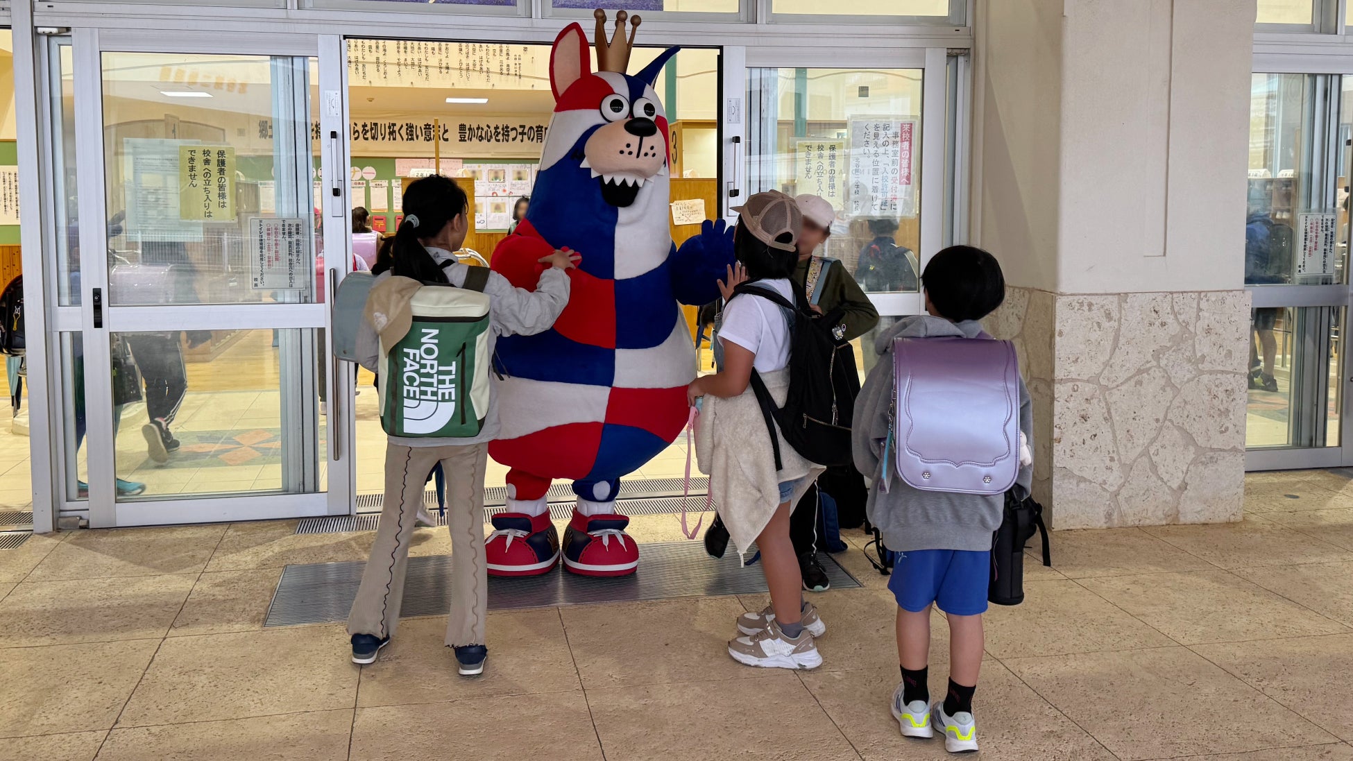北谷小学校では、北谷町イメージキャラクターの「ちーたん」と一緒にあいさつ運動を行い、子どもたちの笑顔と活気にあふれた、楽しい朝の時間となりました。