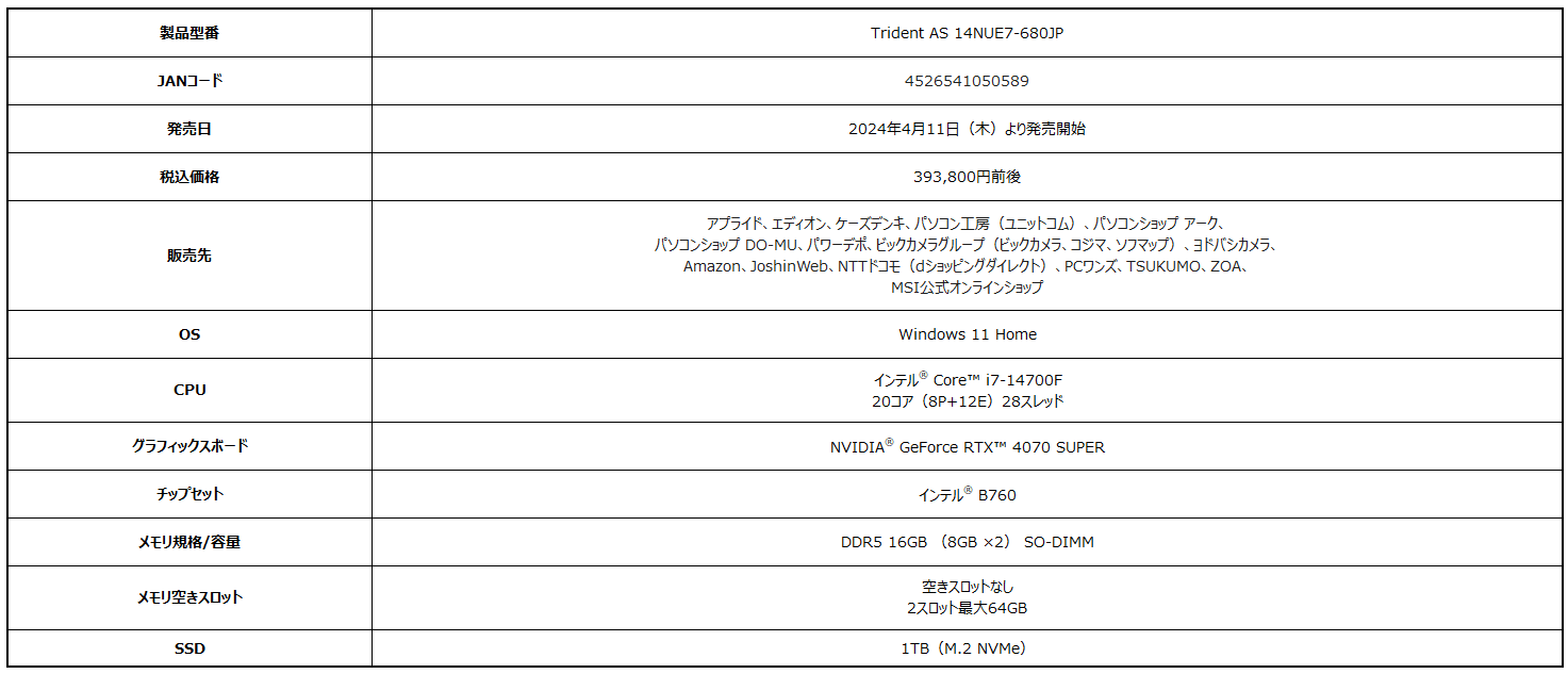 最新の第14世代 インテル® Core™ i7、 RTX™ 4070 SUPER搭載 ハイスペックモデル「Trident AS 14NUE7-680JP」発売