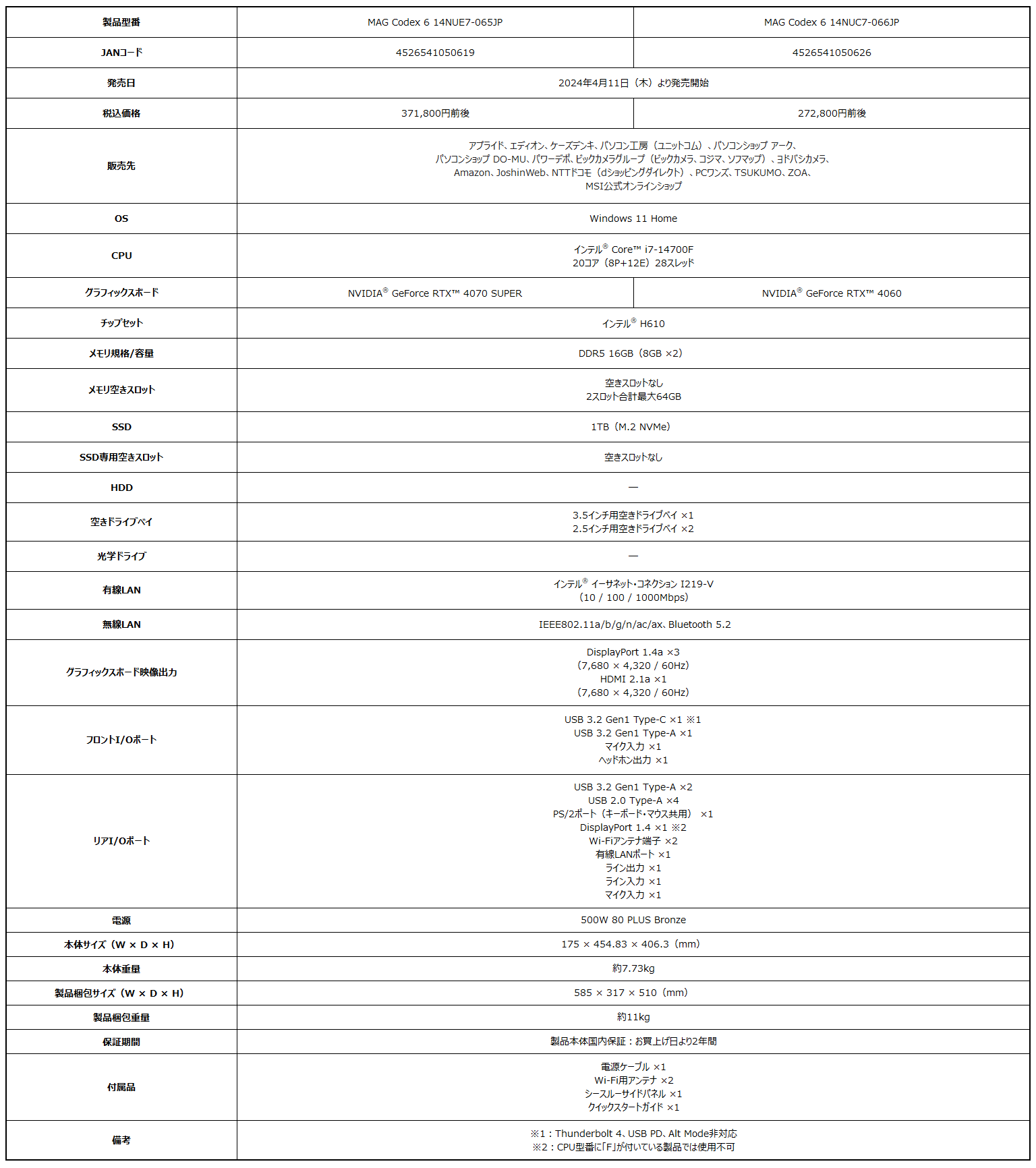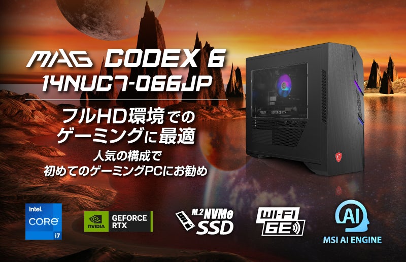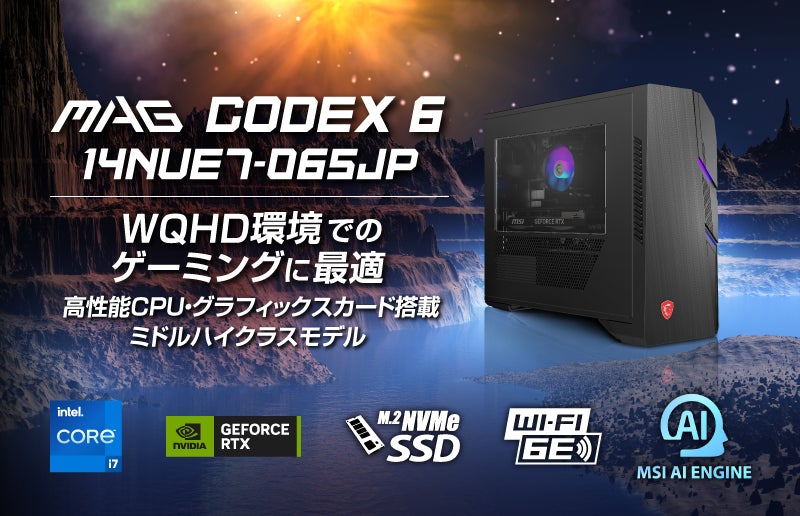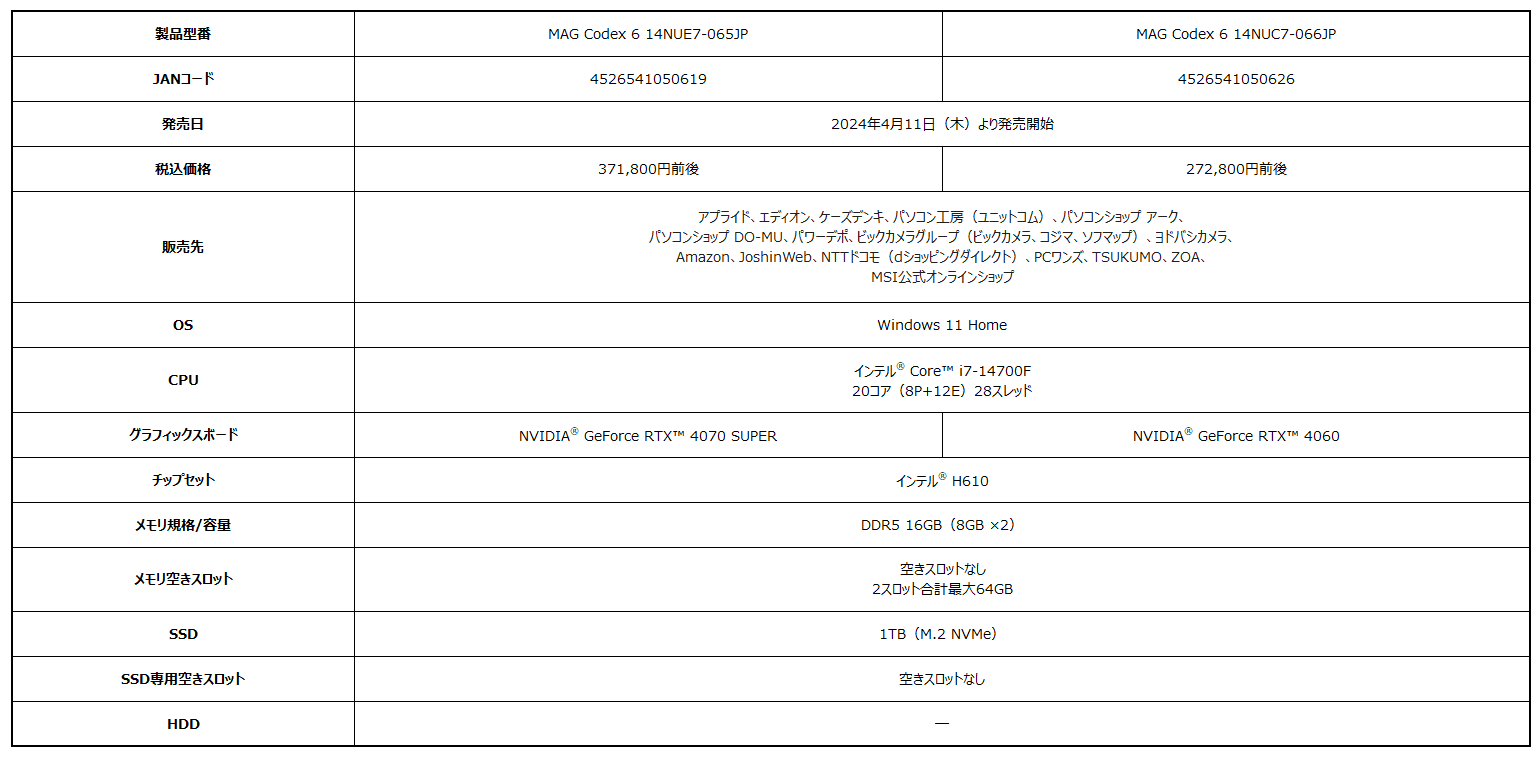また、同じく2024年4月11日(木)より人気のPCパーツを取り入れ、コストパフォーマンスに優れたゲーミングデスクトップPCブランド『MAG Codex』シリーズから、最新の第14世代インテル® Core™ i7-14700F、NVIDIA® GeForce RTX™ 4070 SUPERを搭載しWQHD環境に最適な「MAG Codex 6 14NUE7-065JP」、NVIDIA® GeForce RTX™ 4060を搭載し、ゲーミングPC入門に最適な「MAG Codex 6 14NUC7-066JP」が新たにラインナップに加わります。