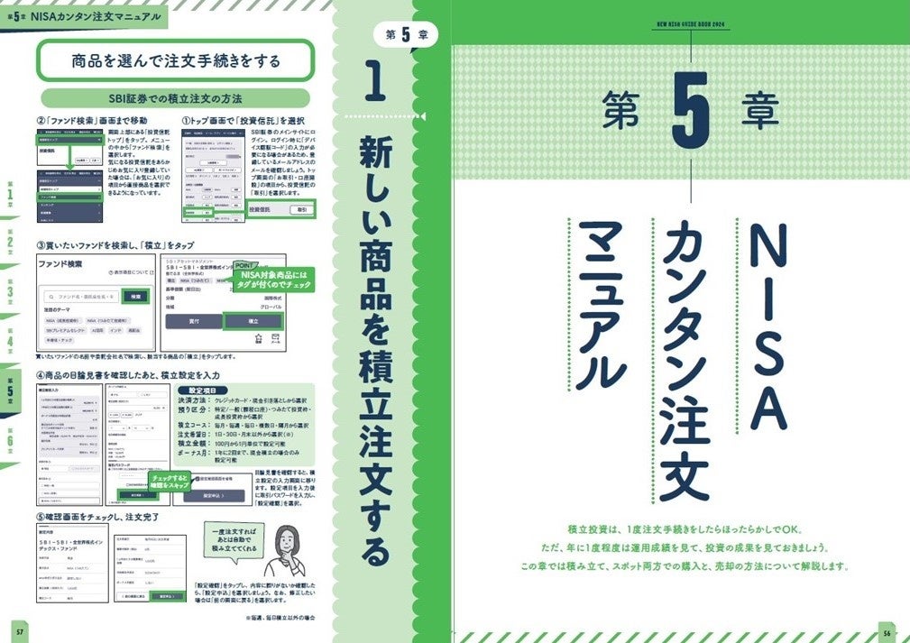 積立投資の場合、一度注文手続きをしてしまえばあとはそのままほったらかしでもOKですが、スポット購入したり運用成績を確認する際に頼りになるページが、第5章の簡単注文・操作マニュアル。運用の見直しを行なった結果、もし配分を変更したり、投資金額を上乗せしたいという場合もオンラインなら簡単にできます。売却や購入についても、実際のスマホ画面を見ながら注文~確定までのフローをわかりやすく説明していきます。