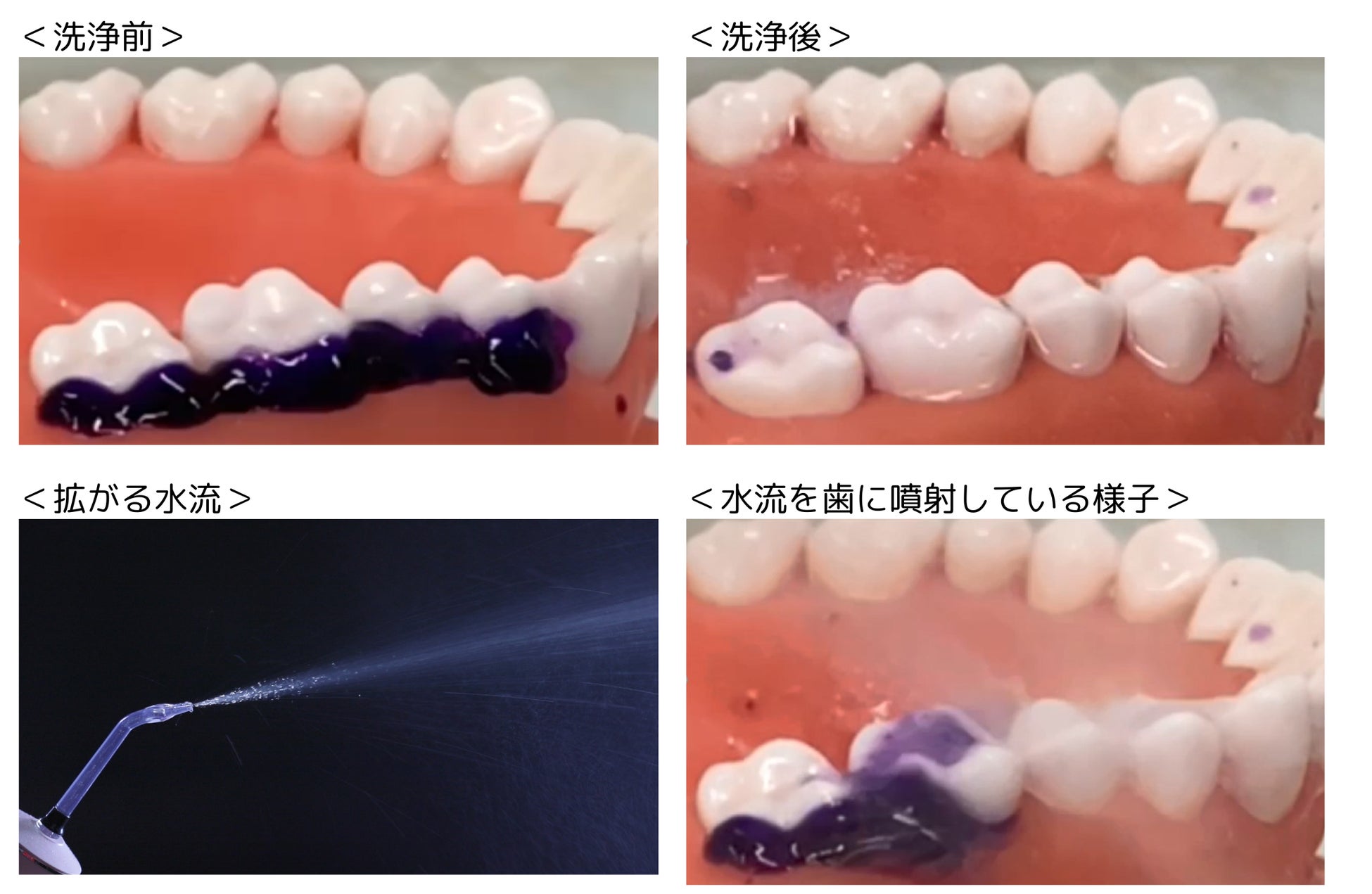 特殊な形状のトルネードノズルで渦巻き状の水流を作り出し、拡がりながら噴射することでパワフルながらも歯茎にやさしい洗浄を実現。歯間の汚れもしっかり落とすことが可能です。