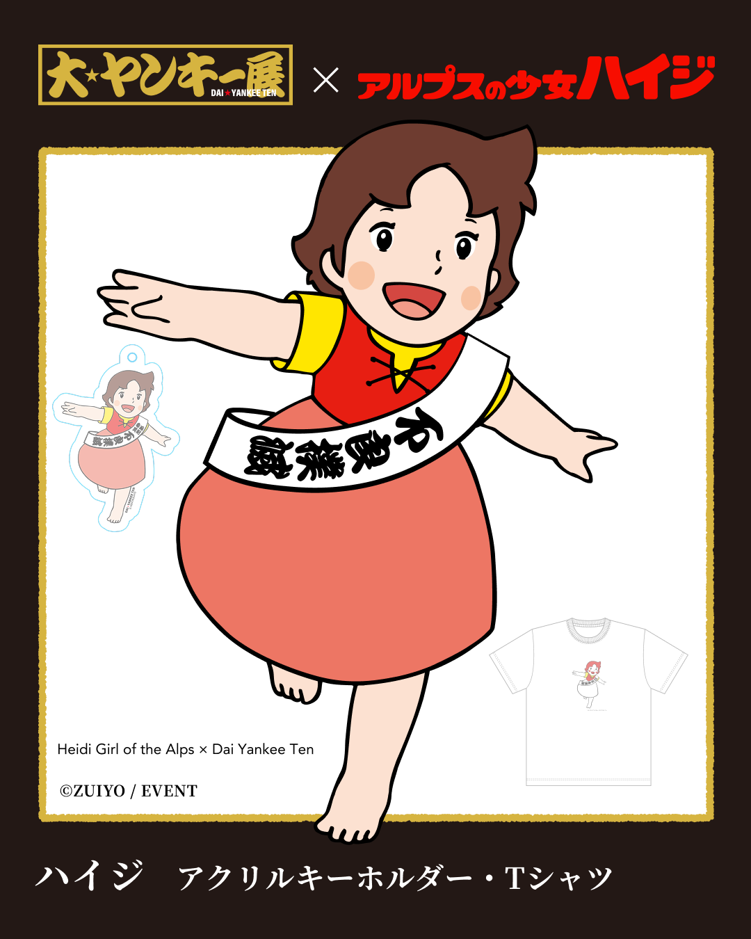 さらに、「大ヤンキー展」公式グッズ18種も販売します。グラフィックデザイナーの田中秀幸氏が描き下ろした公式キャラクター「マブ&トモ」グッズのほか、『アルプスの少女ハイジ』や「なめ猫」とのコラボレーション商品も展開します。