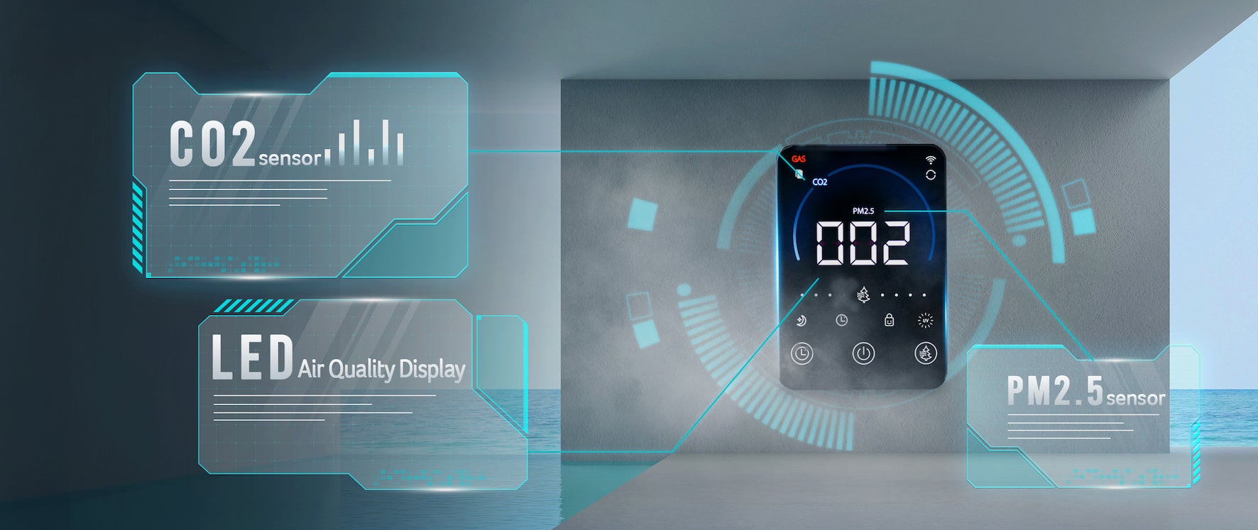 レーザー粒子センサー、ガスセンサー(VOC)、CO2センサーを備え、本体ディスプレイやアプリ画面に情報を表示。検知した粒子は数値を、ガスは「GAS」マークが点灯、CO2はLEDリングが点灯する事で情報を解かり易く表示。また、状況に応じて本体ディスプレイ背面のLEDが青、黄、赤色に切り替わることで視覚的に情報を提供します。