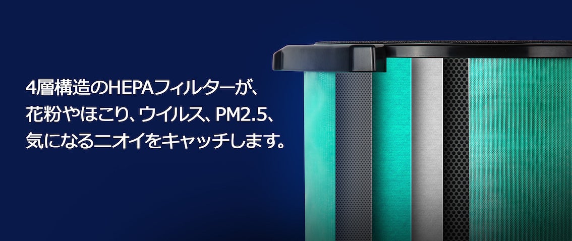 細菌やウイルスに対して強い効果を発揮するUVC LEDを採用HEPA13フィルターと抗菌コート層を持った4in1 HEPAフィルターが花粉やPM2.5やにおいをキャッチ!