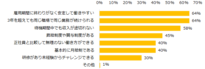 ・お正月やお盆などの連休がある月でも収入が安定するので、安心して働ける。また、仕事を失う不安感が少ないので、就業先でも自分の意見を出しやすい。(30代女性)
