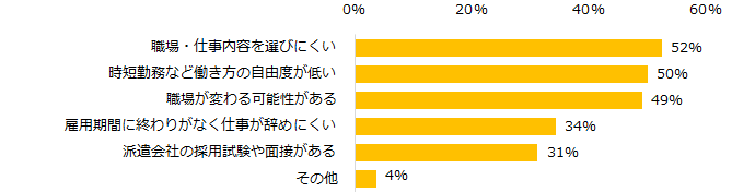・仕事内容や勤務地、時間など自分の生活に合わせて変更できるという派遣の良さが薄れているように感じるから。(30代男性)