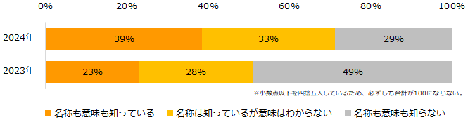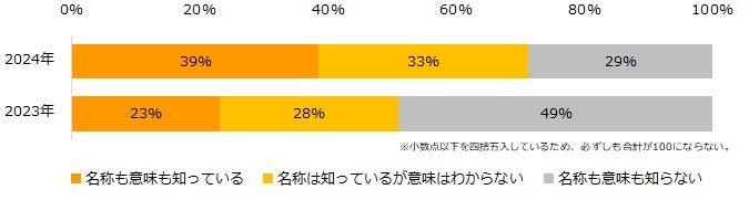 1:「無期雇用派遣」を理解している方は39%で、前年比16ポイント増。「名称も意味も知らない」は20ポイント減で、認知の広がりがうかがえる結果に。(図1~3)