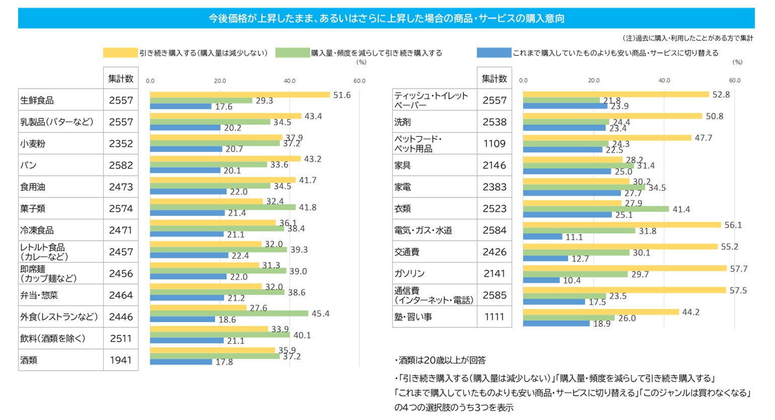 「引き続き購入する(購入量は減少しない)」が多いのは、「生鮮食品」「ティッシュ・トイレットペーパー」「洗剤」「ペットフード・ペット用品」「電気・ガス・水道」「交通費」「ガソリン」「通信費(インターネット・電話)」等で、生活に欠かせないものでした。「購入量・頻度を減らして引き続き購入する」が多い品目は「外食(レストランなど)」「衣類」が上がりました。食品の中では「菓子類」は「購入量・頻度を減らして引き続き購入する」が多くなっています。