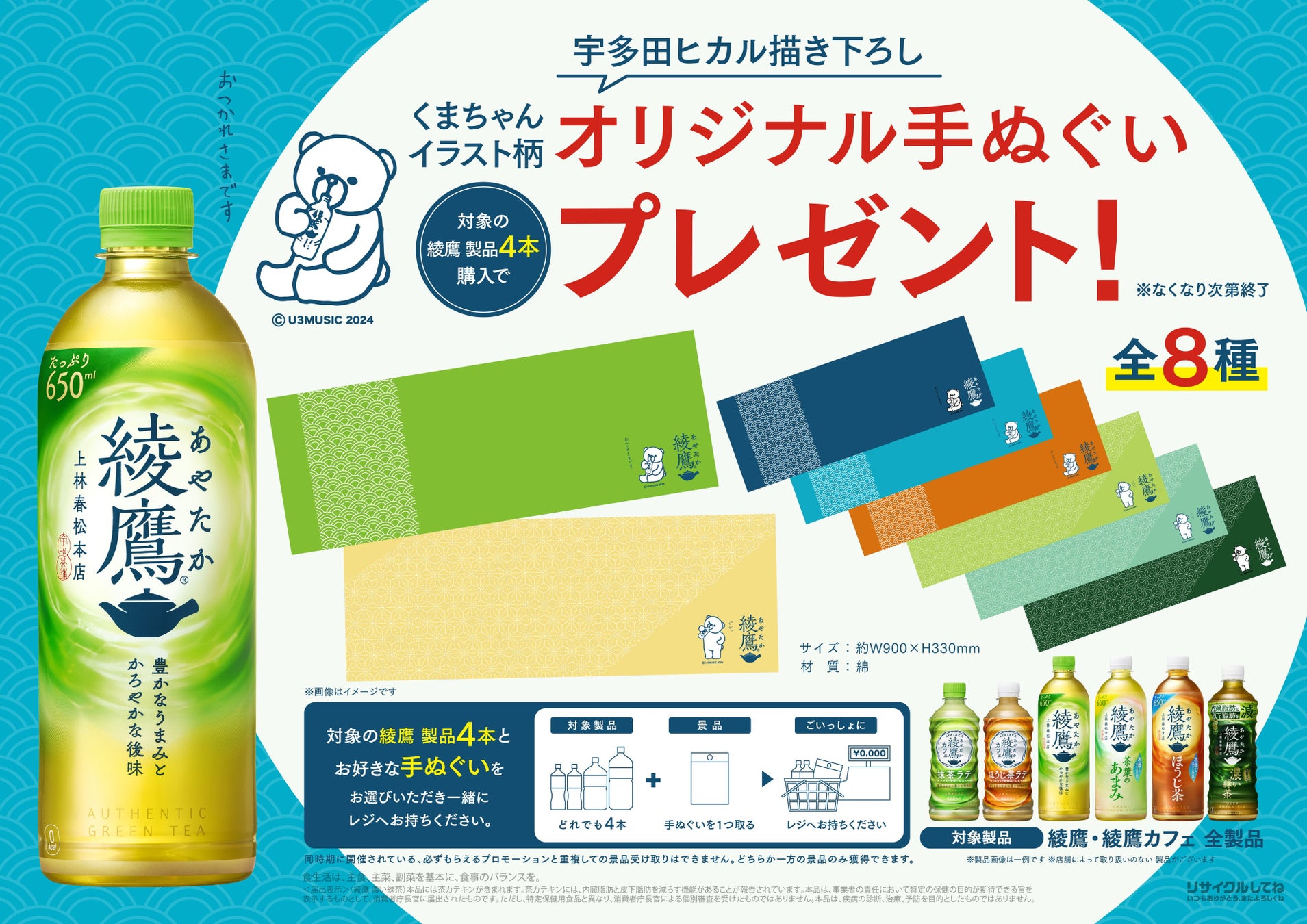 「綾鷹」「綾鷹 カフェ」など対象製品を4本購入につき1つの景品が手に入る、プレゼントキャンペーンを実施。夏にぴったりな、宇多田ヒカルさん描き下ろし‘くまちゃん’イラスト柄オリジナル手ぬぐいをプレゼント。