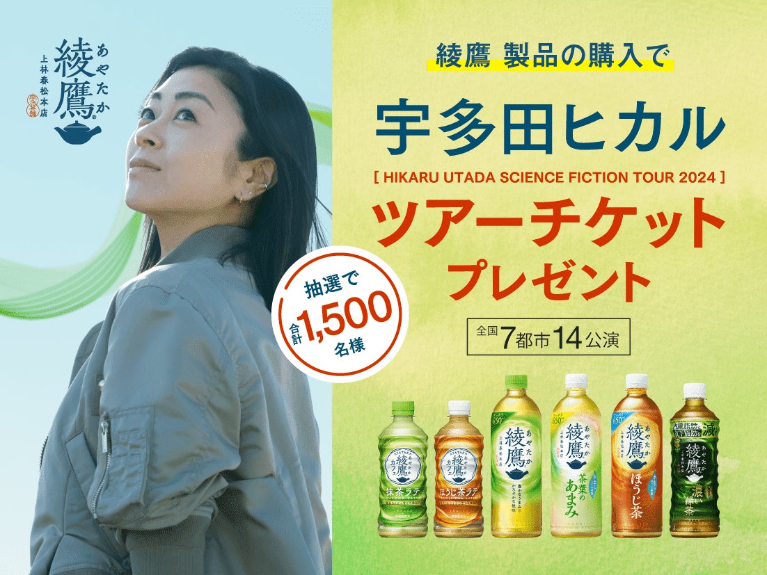 「綾鷹」の新アンバサダー宇多田ヒカルさんとコラボレーションした新たなキャンペーンを実施。「綾鷹」などの対象製品を購入した方のうち、抽選で合計1,500名様に、デビューから25周年を迎えた宇多田ヒカルさんの、約6年ぶりとなるツアー「HIKARU UTADA SCIENCE FICTION TOUR 2024」の全国7都市・14公演予定のツアーチケットをプレゼントします。