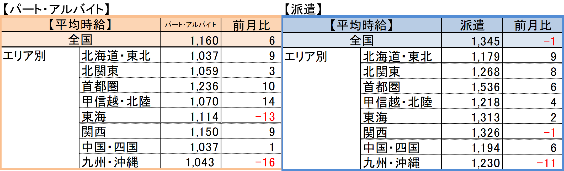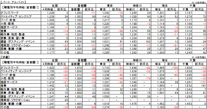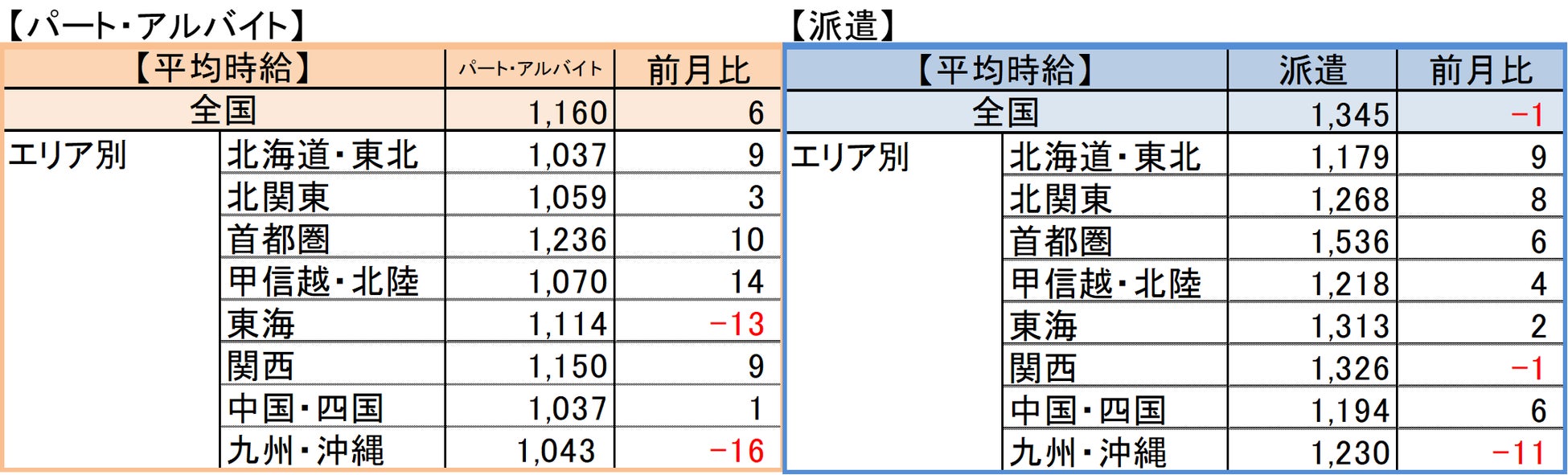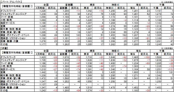 【パート・アルバイト】全国・全職種平均時給は1,160円。前月比+6円。前年同月比+64円。 【派遣】全国・全職種平均時給は1,345円。前月比-1円。前年同月比+26円。 パート・アルバイトの平均時給が上昇した要因の1つは、「医療・看護・介護」カテゴリで、全職種平均より時給の高い『資格必須の訪問介護スタッフ』や『障がい者ケア施設のオープニングスタッフ』の求人が首都圏を中心に多数掲載されたため。 また、同カテゴリの平均時給は、前年同月より107円高い1,276円で、同条件で比較可能な2020年9月以降で過去最高だった。慢性的な人手不足が続いている業界であり、人手獲得のために数年前から徐々に賃上げをする動きが影響したとみられる。 派遣の平均時給は横ばい。 |