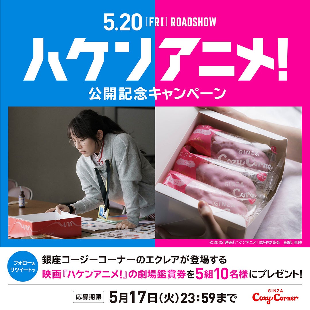 株式会社銀座コージーコーナー<代表取締役社長 船田知秀 東京都中央区>は、2022年5月12日(木)から5月17日(火)まで、映画『ハケンアニメ!』の劇場鑑賞券が抽選で5組10名様に当たるTwitterキャンペーンを開催します。
