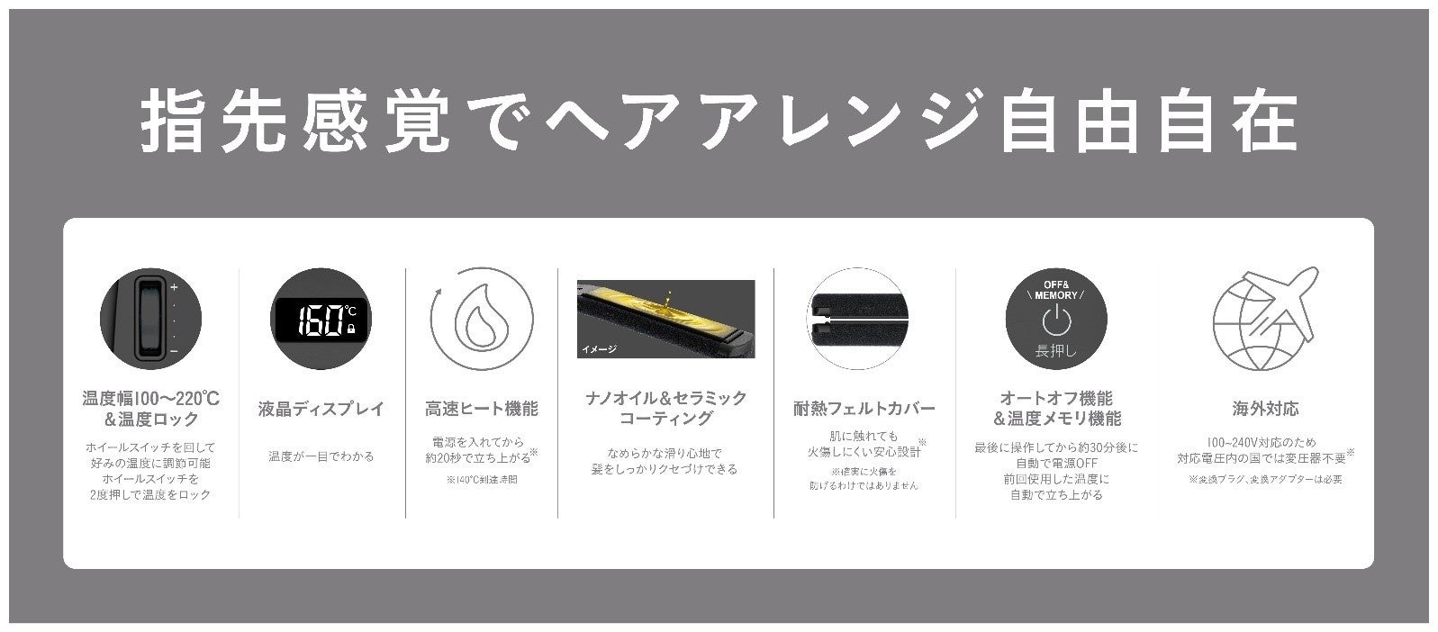 ・髪の根元や顔周りに触れても熱を感じにくい耐熱フェルトカバー付きで、初心者でも火傷の心配が少ない仕様です。