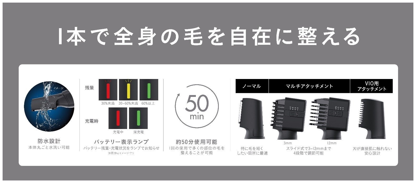 ・3、6、9、12mmまで4段階で長さ調節可能なマルチアタッチメントと、刃が直接肌に触れないよう設計されたVIO用(2mm)の2種類のアタッチメント付き(アタッチメントなしの仕上がり長さ約0.5mm)。