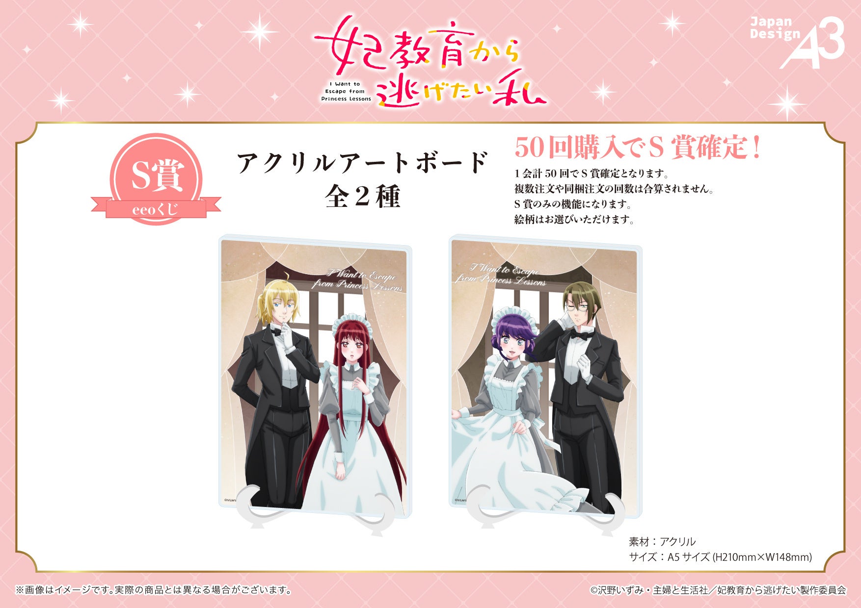 TVアニメ『妃教育から逃げたい私』の「eeoくじ」の中で、一番レアなS賞はA5サイズ(およそ15cm×21cm)のアクリルアートボード!
