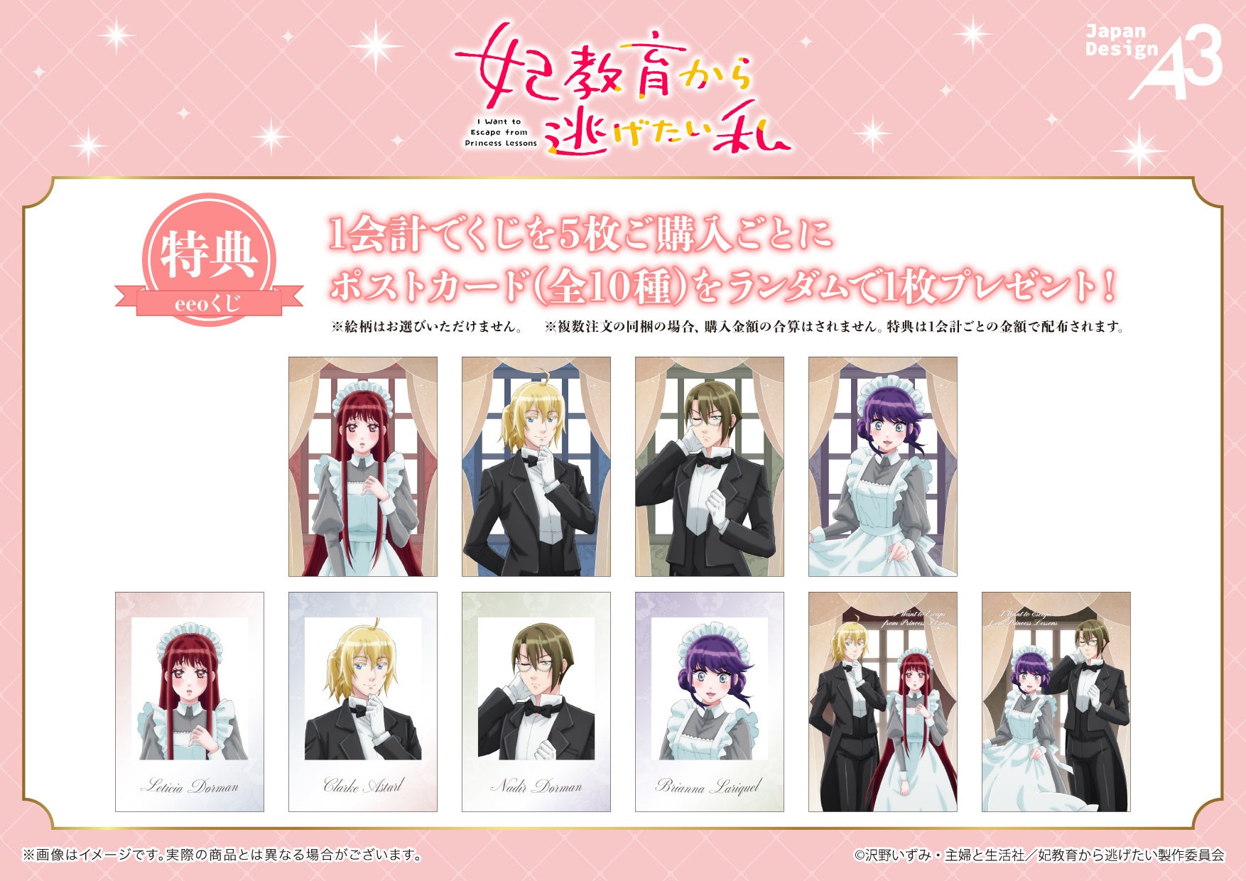 TVアニメ『妃教育から逃げたい私』の「eeoくじ」を1会計で5枚お買い上げごとに、ポストカード(全10種)をランダムで1枚プレゼントします。