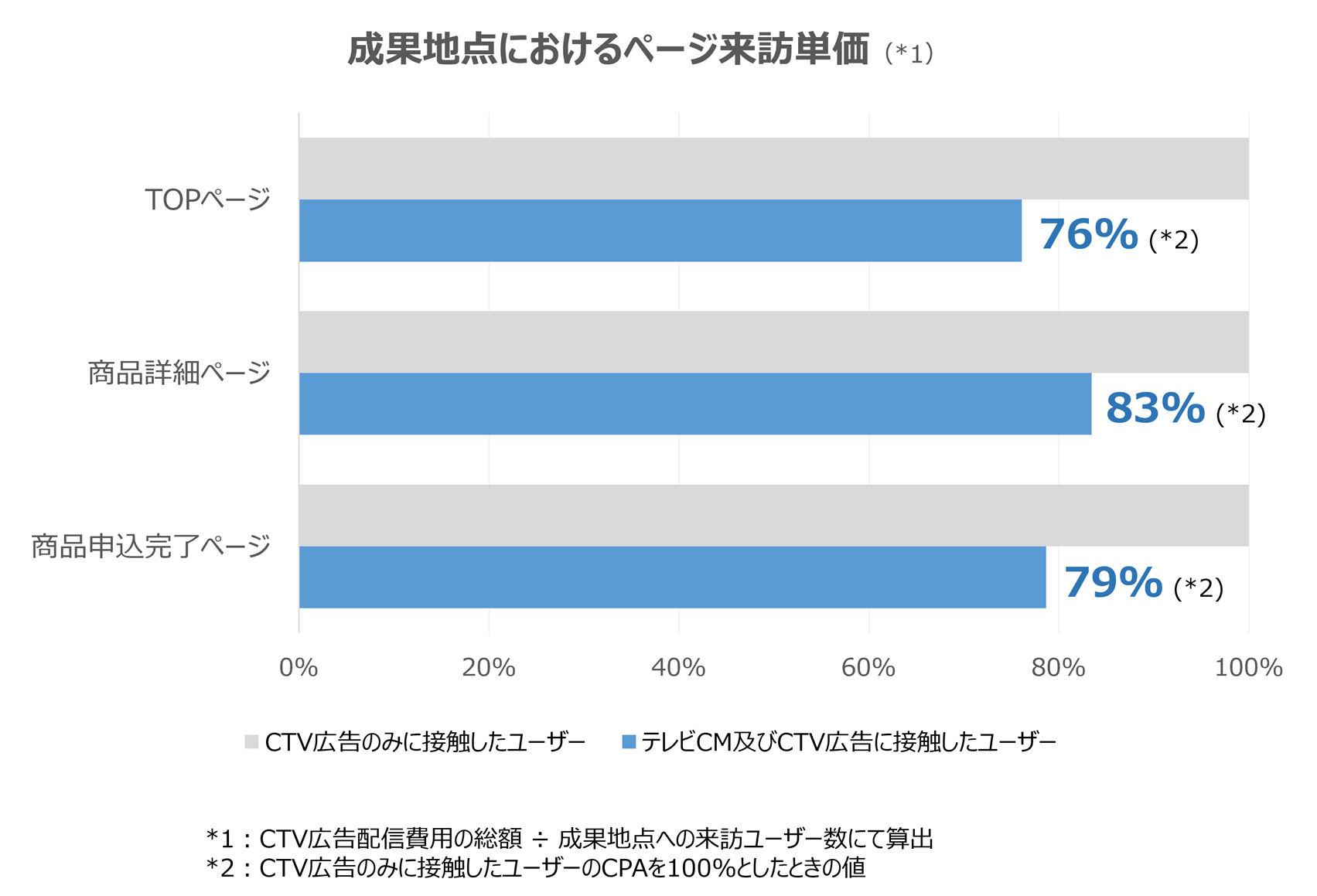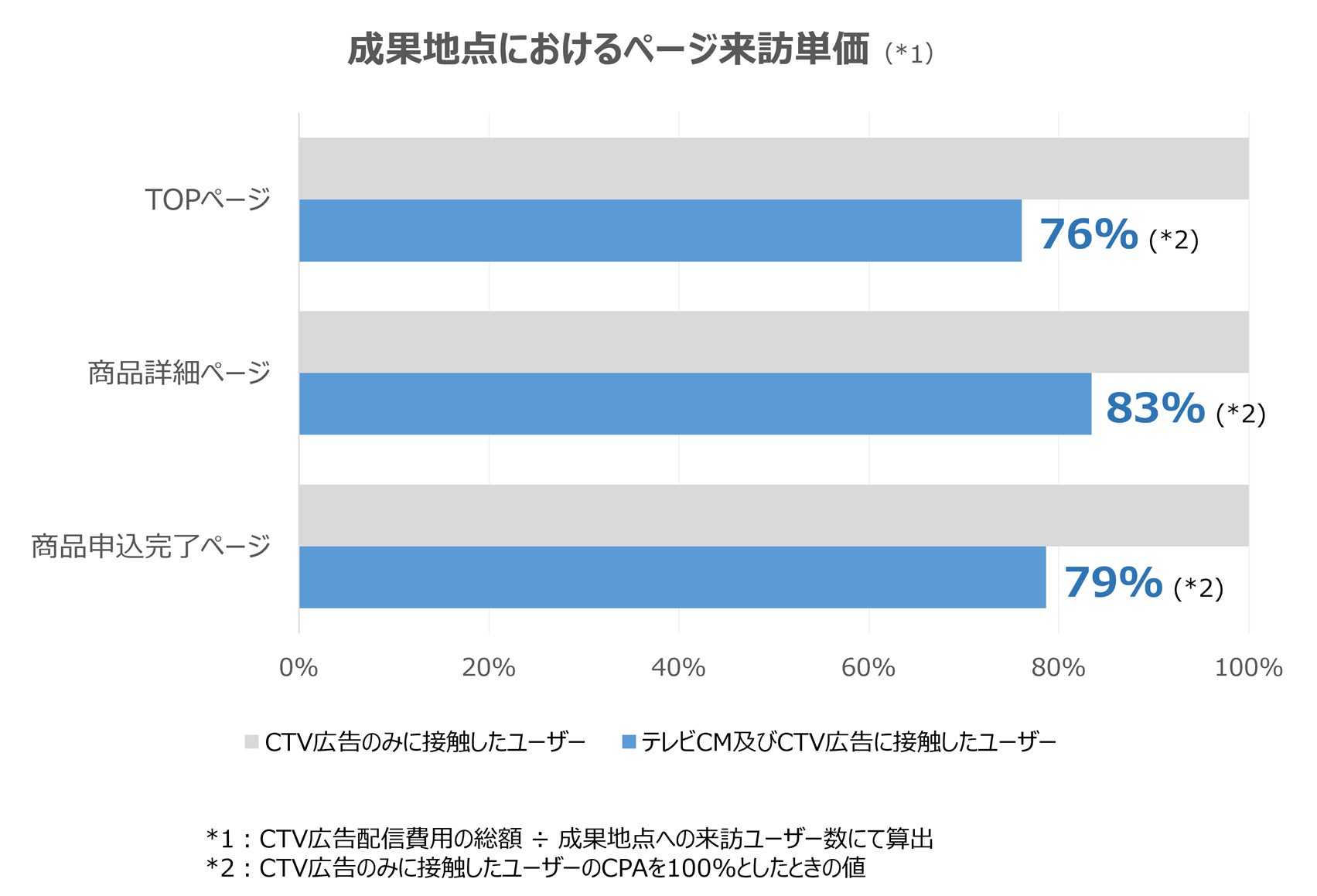 | 検証内容 | A社のクレジットカードに関するテレビCMおよびCTV広告に接触した ユーザーと、同商品のCTV広告のみに接触したユーザーの、サイトTOPページ、商品詳細ページ、商品申込完了ページにおけるページ来訪単価の差異 |
