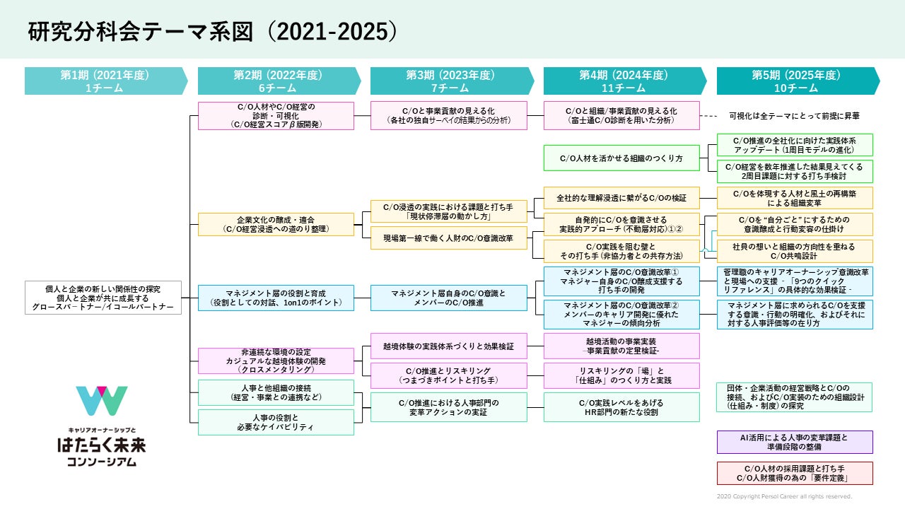キャリアオーナーシップ人材を事業成長の力に変える「個人と企業が共に成長しあう新しい関係性」を模索する企業・団体が業界を超えて集まり、その実践論について議論・実践・検証を行う「キャリアオーナーシップとはたらく未来コンソーシアム」< https://co-consortium.persol-career.co.jp/ >では、第5期(2025年度)の10の研究テーマを決定しました。