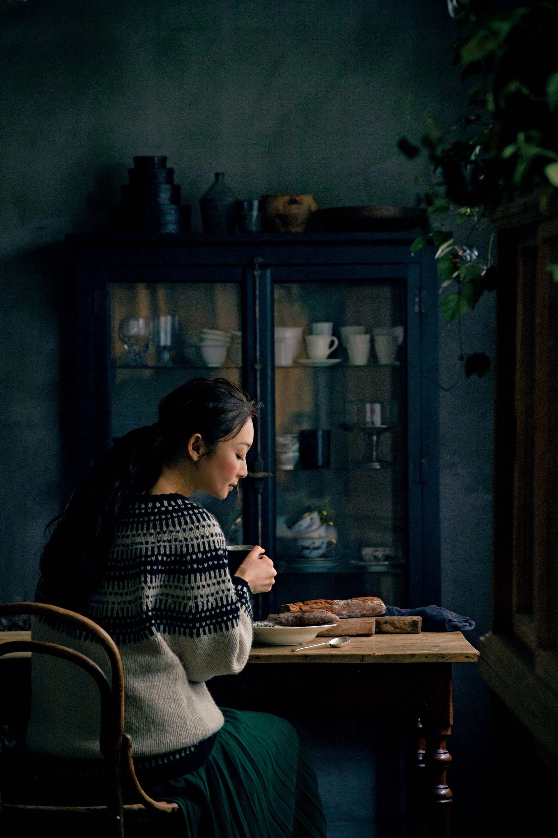 雅姫さん自らシックな色合いに塗装したという食器棚