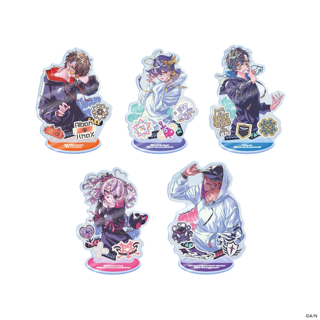ラインナップは描き下ろしビジュアルを使用したアクリルスタンド、スクエア缶バッジと、ライバー達がビジュアル内で使用しているステッカーセットの計3種。