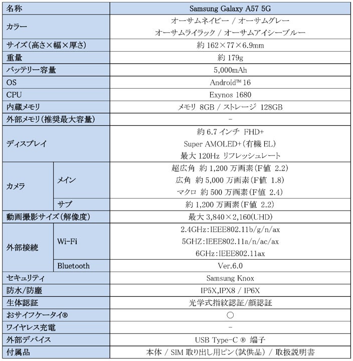 <主な仕様:「Samsung Galaxy A57 5G」>
