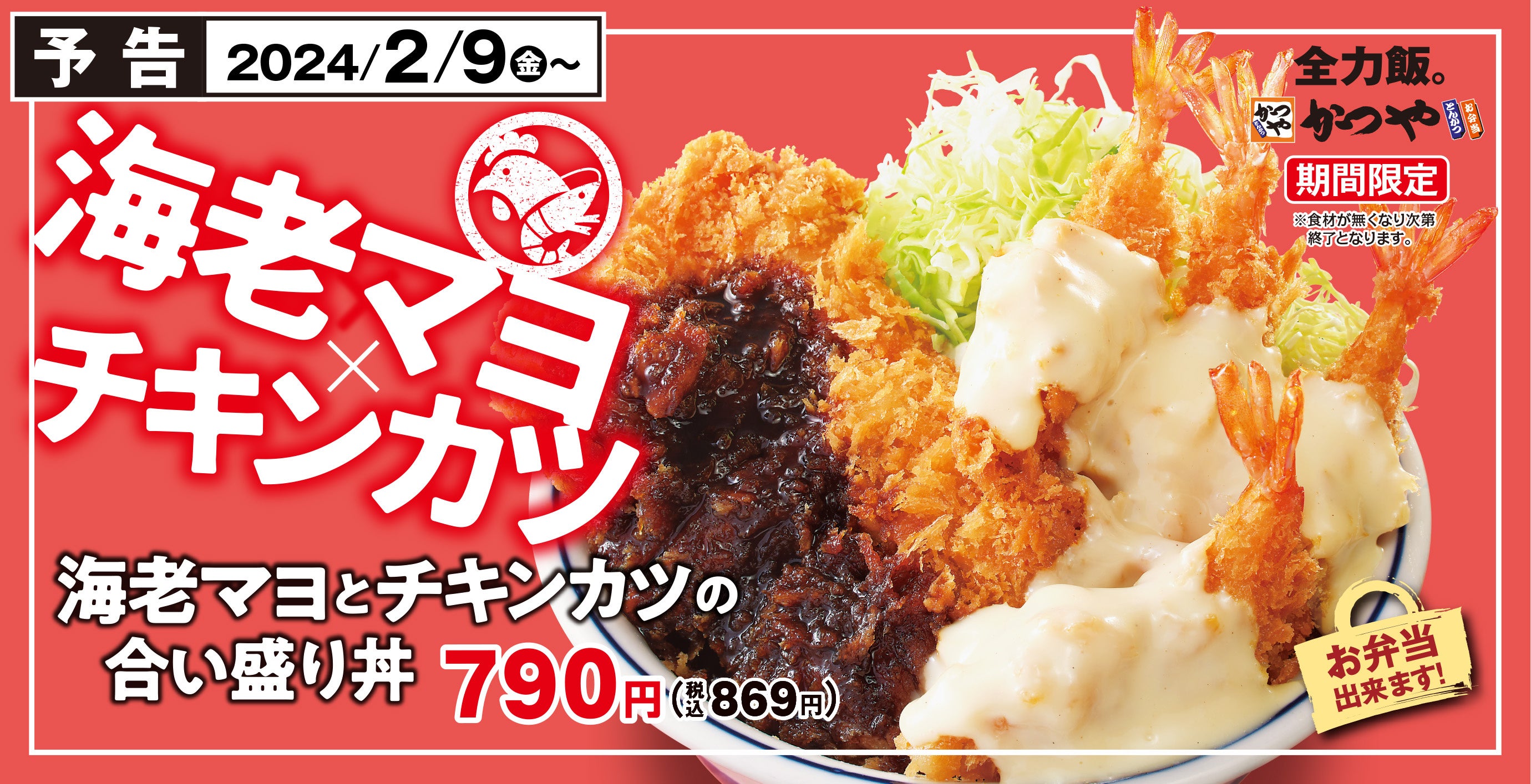 アークランドサービスホールディングス株式会社の⼦会社、とんかつ専⾨店「かつや」を展開している株式会社かつや(本社:東京都千代⽥区/代表:⼤内 勇⼀)は、国内「かつや」にて「海老マヨとチキンカツの合い盛り」を2024年2月9日(金)より期間限定で販売を開始いたします。