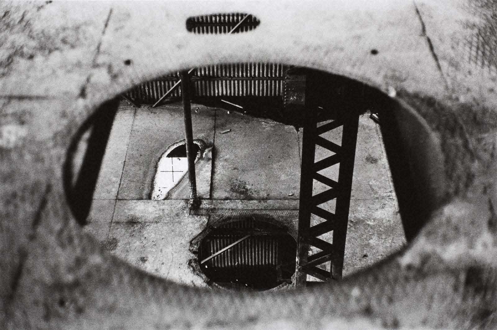 1955年4月、靉嘔(1931-)、池田満寿夫(1934-1997)、堀内康司(1932-2011)、真鍋博(1932-2000)の4人の画家たちが、反画壇を標榜する「グループ“実在者”」を結成し、奈良原はそこにオブザーバーのような形で参加しています。堀内は前年に出会った仲間たちを、自ら作品を描いていた王子の廃墟へと案内しました。奈良原はすでに大阪で廃墟を撮っており、王子での撮影も含めてこの廃墟の詩《無国籍地》のシリーズを生み出していったのです。