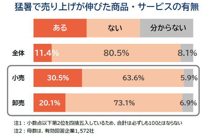 猛暑で売り上げが伸びた商品・サービスがある企業は11.4%。業界別では『小売』が3割でトップ
