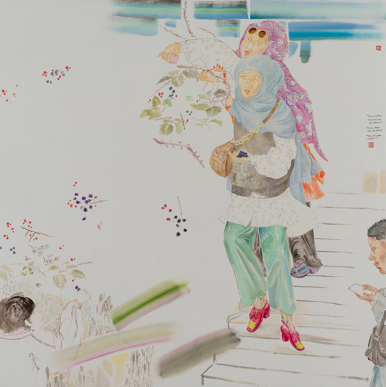 中国・成都出身オランダ・ロッテルダム在住のエヴェリン・タオチェン・ワンは、多岐にわたるメディアの表現により高い評価を獲得していますが、油彩画《トルコ人女性たちのブラックベリー》(2023) では、伝統的な中国の書画と西洋美術の絵画技術を柔軟に取り込むとともに、ジェンダー問題や植民地史をテーマに浮かび上がらせます。