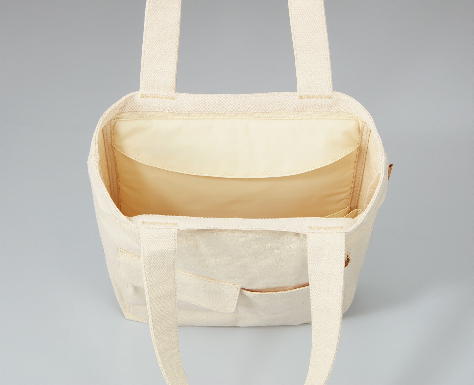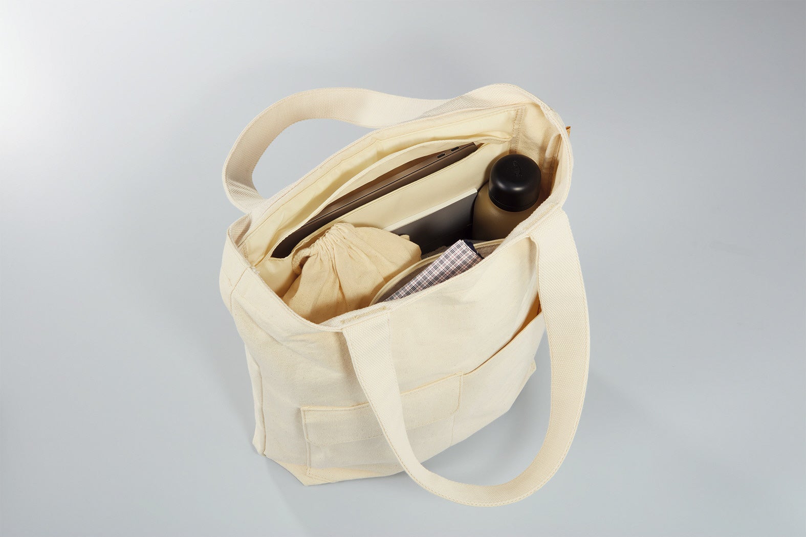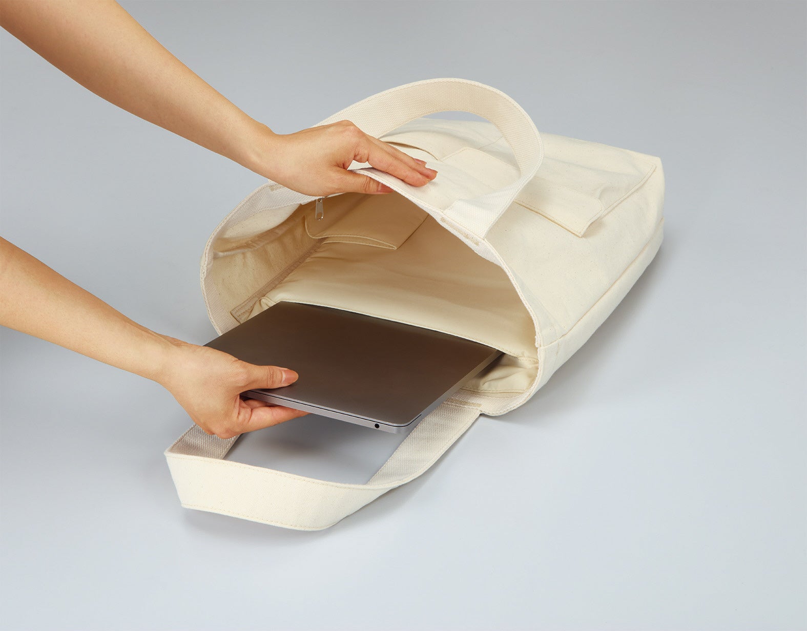 クッションポケット付きで、ケースに入れなくてもパソコンやタブレットを安心して持ち運ぶことができるトートバッグです。PCポケット以外にも、荷物を整理して入れられるポケットが外側に2つと内側に1つ、さらにドリンクホルダーが付いており、バッグの中身を整理整頓しながら収容することができます。そして、テスト販売時のお客様の声を受け、一部ポケットの仕様を変更。雨よけ用のPCポケットの蓋部分を、収容物をいれてポケットが手前に膨らんでも外れにくいように楕円形にしたり、内ポケットの収容物が出てしまわないようファスナーを追加したりと、細かいポイントまでお客様の声を商品に反映しました。また持ち手部分は幅を広めに変更することで、肩にかけても落ちにくい仕様となっています。カラーはシンプルなクリームとブラックの2色をご用意しました。
