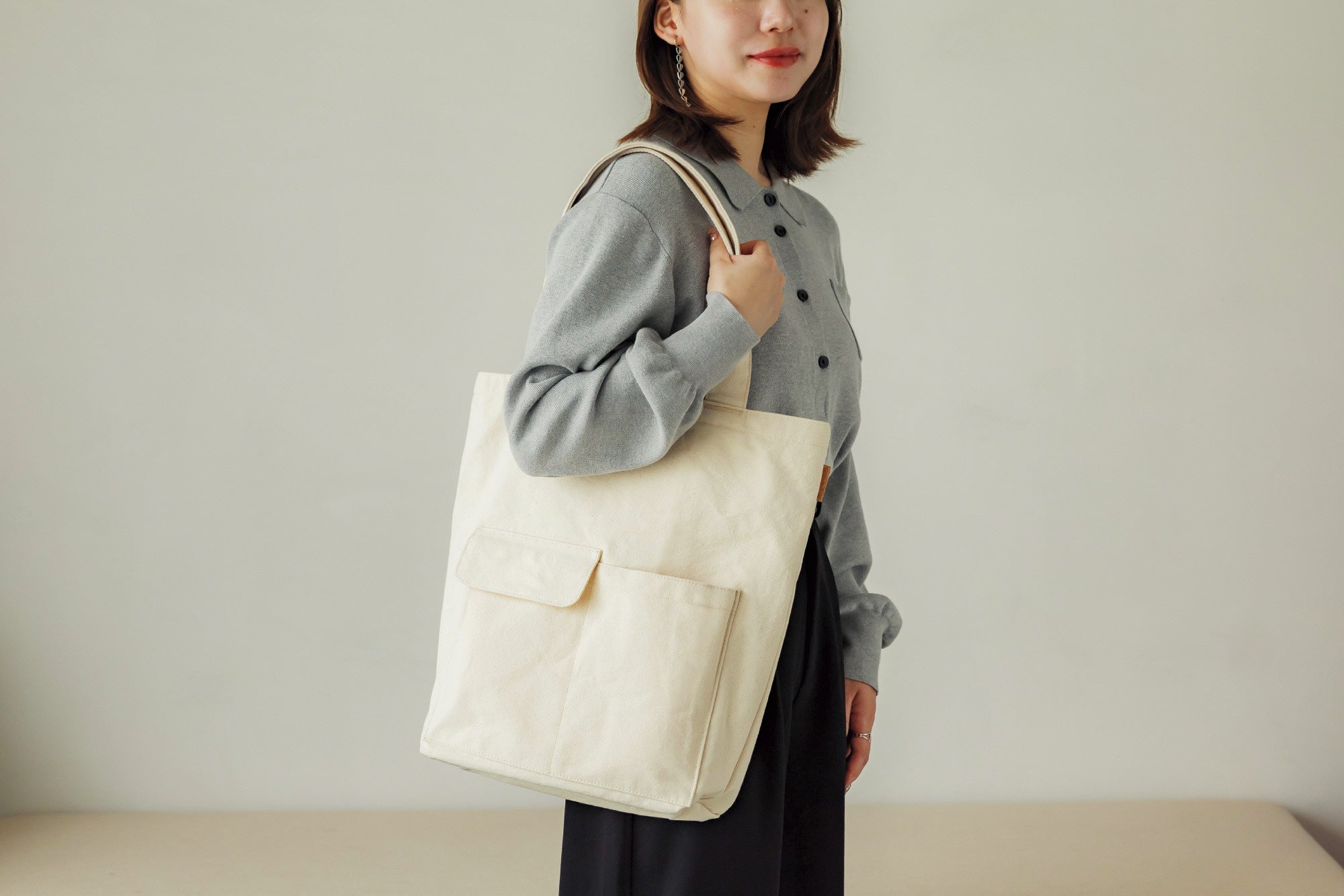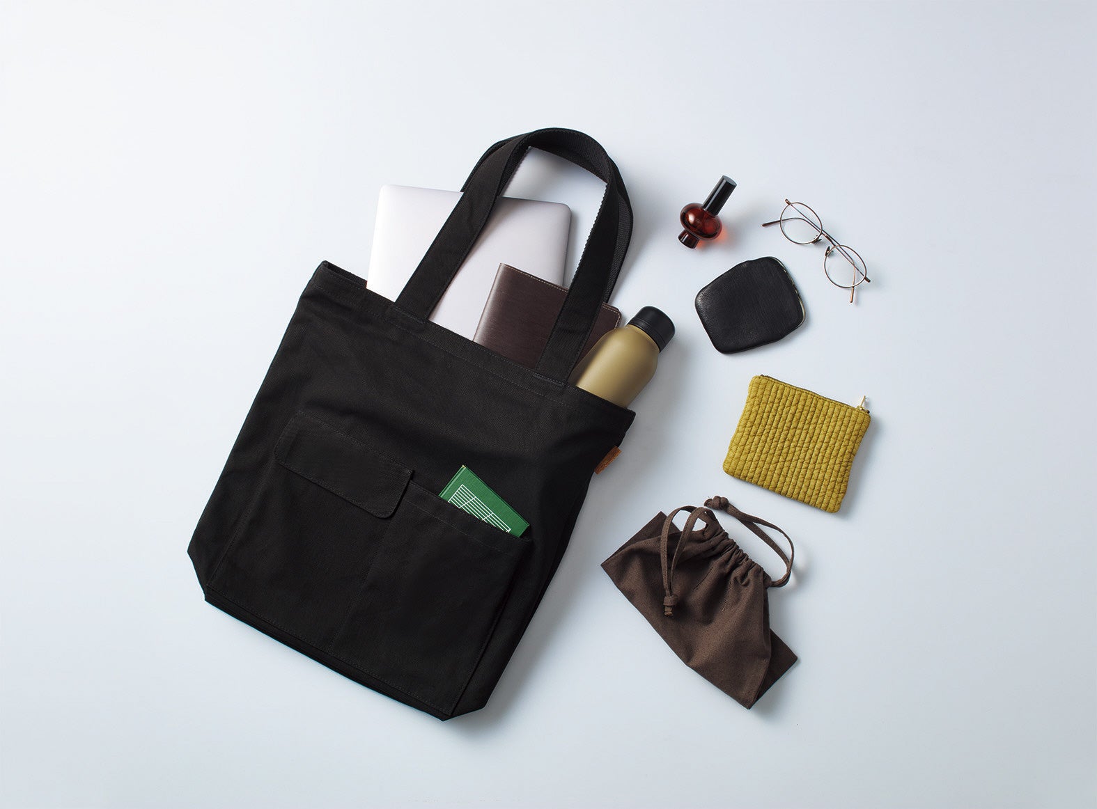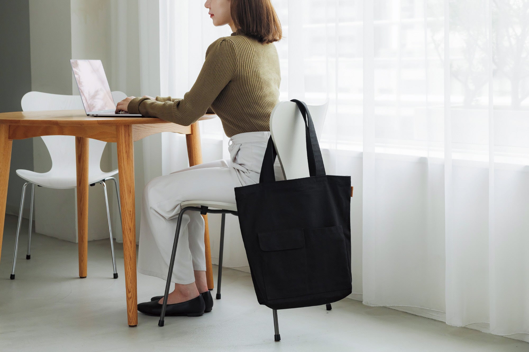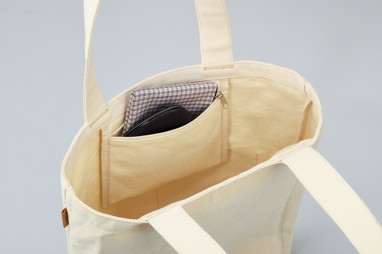 クッションポケット付きで、ケースに入れなくてもパソコンやタブレットを安心して持ち運ぶことができるトートバッグです。PCポケット以外にも、荷物を整理して入れられるポケットが外側に2つと内側に1つ、さらにドリンクホルダーが付いており、バッグの中身を整理整頓しながら収容することができます。そして、テスト販売時のお客様の声を受け、一部ポケットの仕様を変更。雨よけ用のPCポケットの蓋部分を、収容物をいれてポケットが手前に膨らんでも外れにくいように楕円形にしたり、内ポケットの収容物が出てしまわないようファスナーを追加したりと、細かいポイントまでお客様の声を商品に反映しました。また持ち手部分は幅を広めに変更することで、肩にかけても落ちにくい仕様となっています。カラーはシンプルなクリームとブラックの2色をご用意しました。