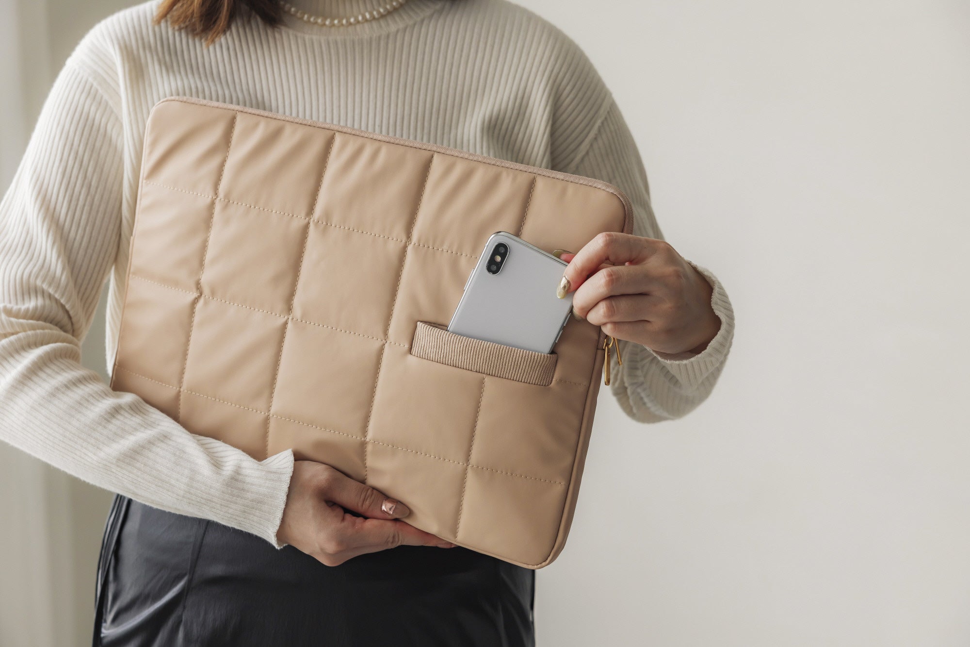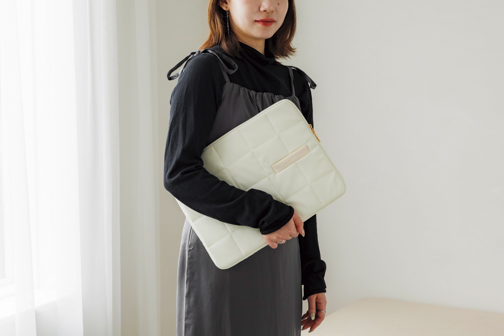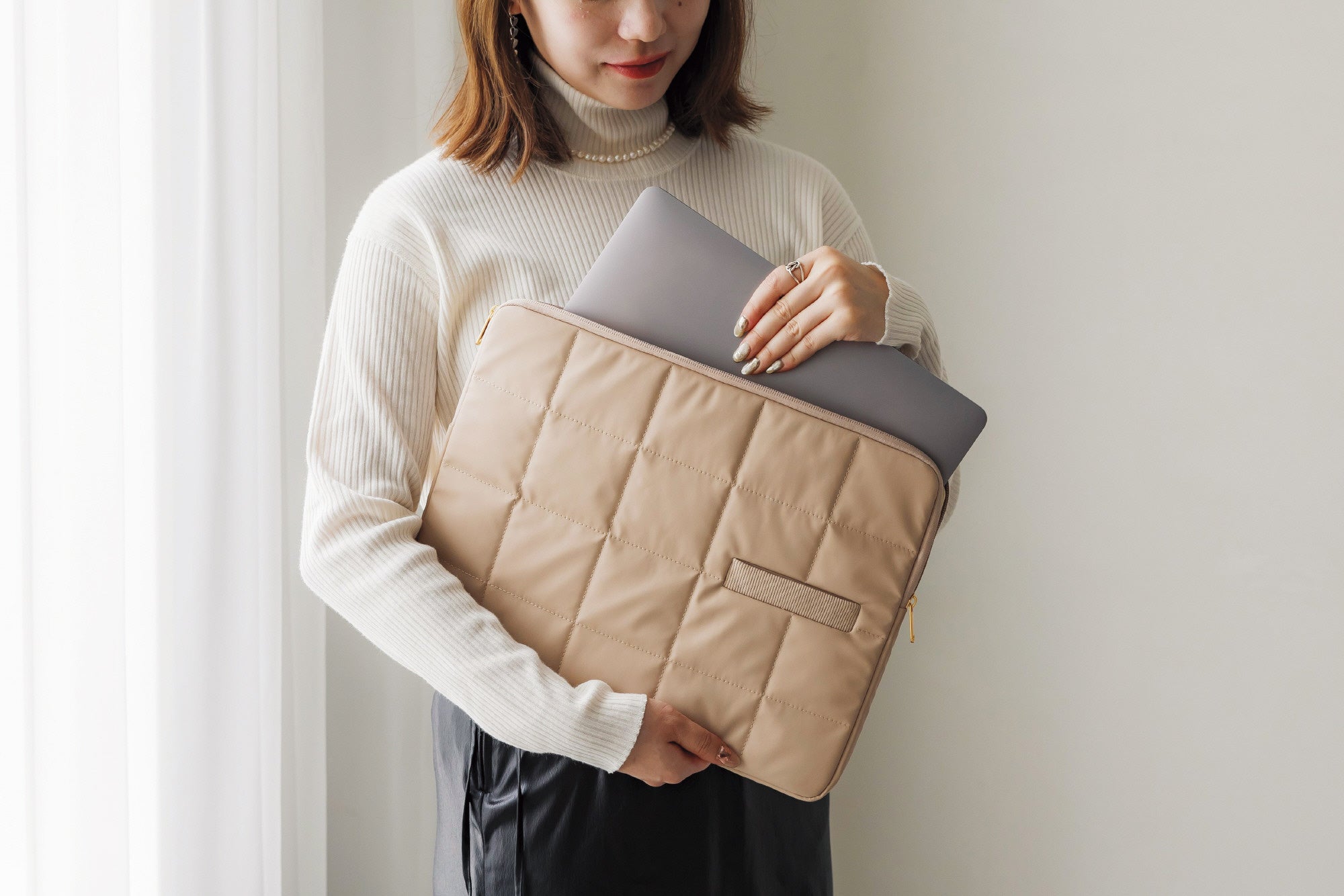 クッション性を備え、14インチノートパソコンと、充電器やマウスなどのPC周辺用品を整理して収容できるPCケースです。中身が整理されることでケースが膨らみにくく、カバンからスムーズに出し入れができます。表生地には、滑らかな触り心地にこだわったキルティングデザインを採用しました。外側のスマートフォンを収容できるポケットは、テスト販売時のお客様の声を受け、リブ生地部分のカラーを、少し色味のあるクリーム色に変更。汚れが目立ちにくく、経年変化による黄ばみも気になりにくい仕様となっています。カラーはクリームとベージュの2色を用意しました。