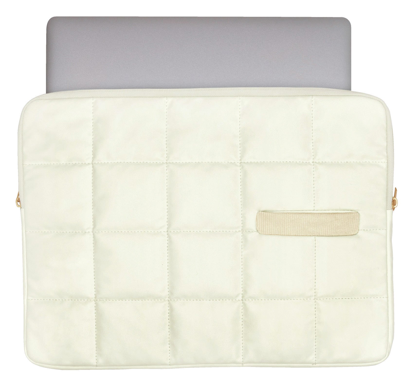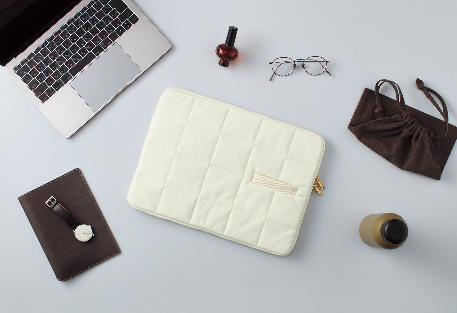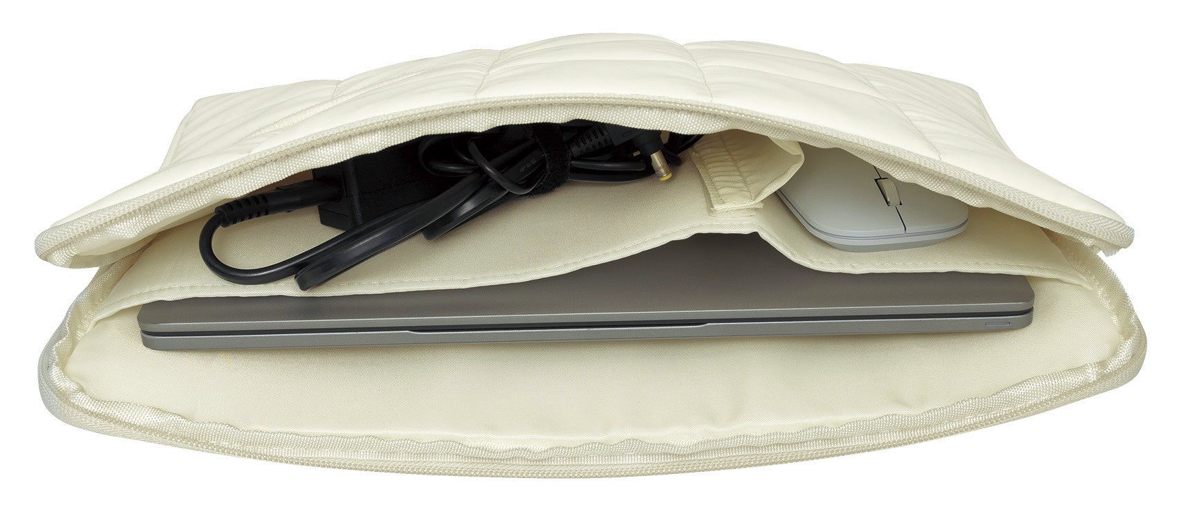 クッション性を備え、14インチノートパソコンと、充電器やマウスなどのPC周辺用品を整理して収容できるPCケースです。中身が整理されることでケースが膨らみにくく、カバンからスムーズに出し入れができます。表生地には、滑らかな触り心地にこだわったキルティングデザインを採用しました。外側のスマートフォンを収容できるポケットは、テスト販売時のお客様の声を受け、リブ生地部分のカラーを、少し色味のあるクリーム色に変更。汚れが目立ちにくく、経年変化による黄ばみも気になりにくい仕様となっています。カラーはクリームとベージュの2色を用意しました。