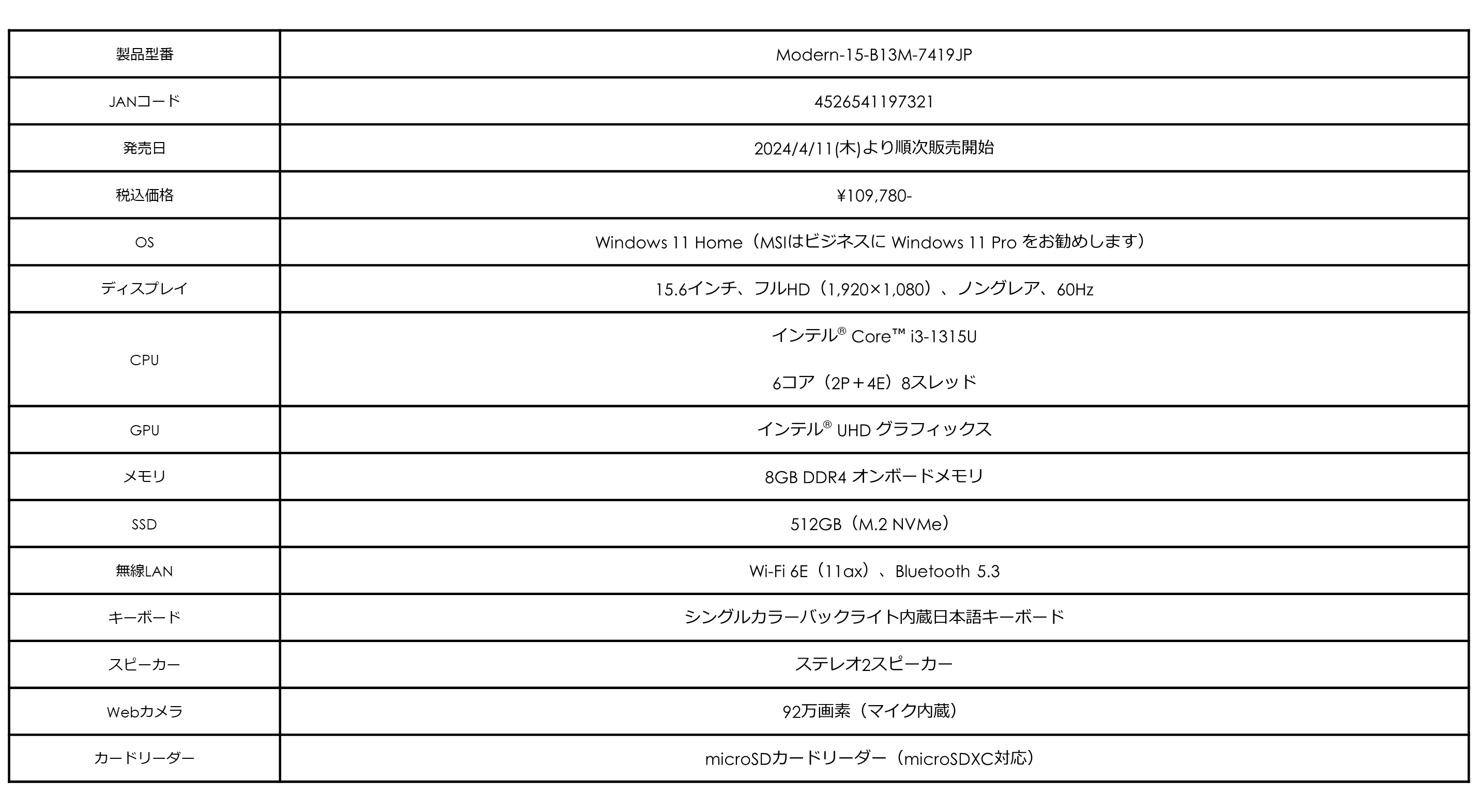 ~15.6インチモデル「Modern-15-B13M-7419JP」を4月11日(木)より発売~