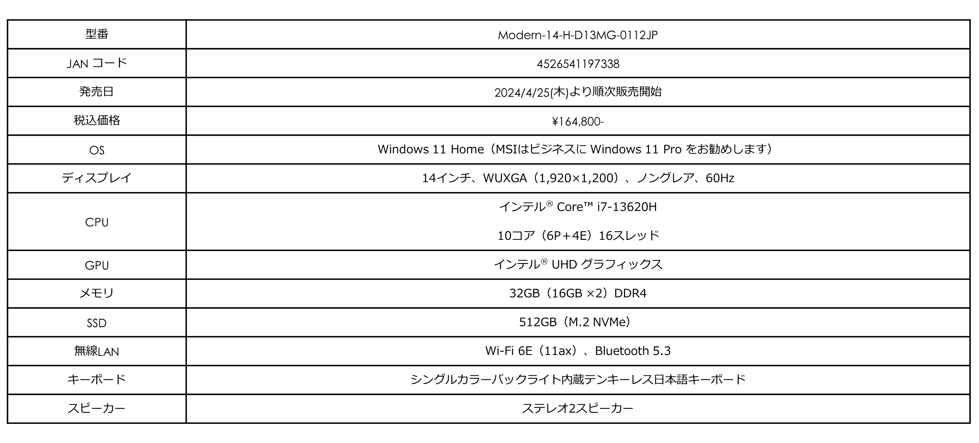 ・Modern 15 H B13M 製品ページ:https://jp.msi.com/Business-Productivity/Modern-15-B13X