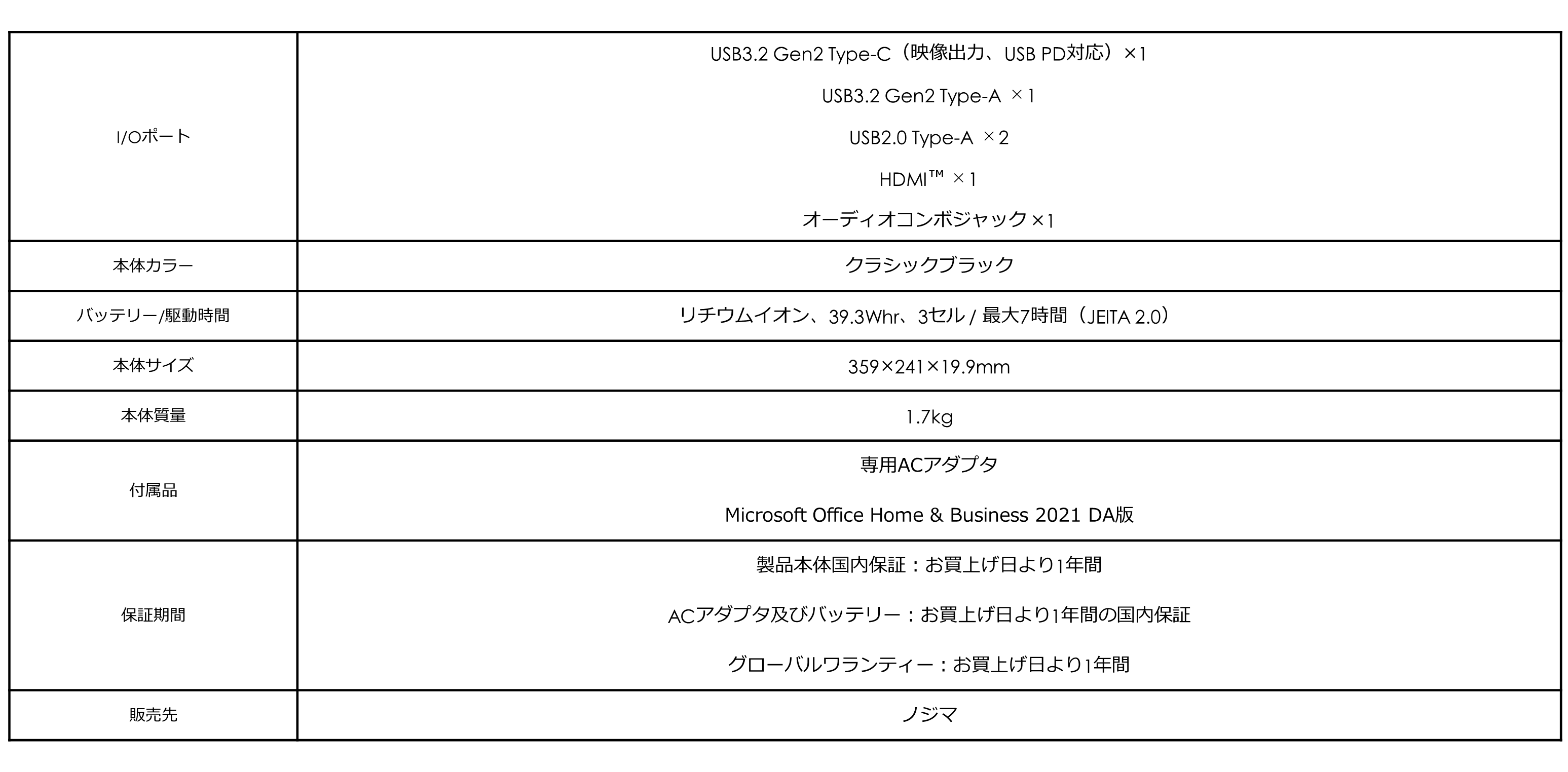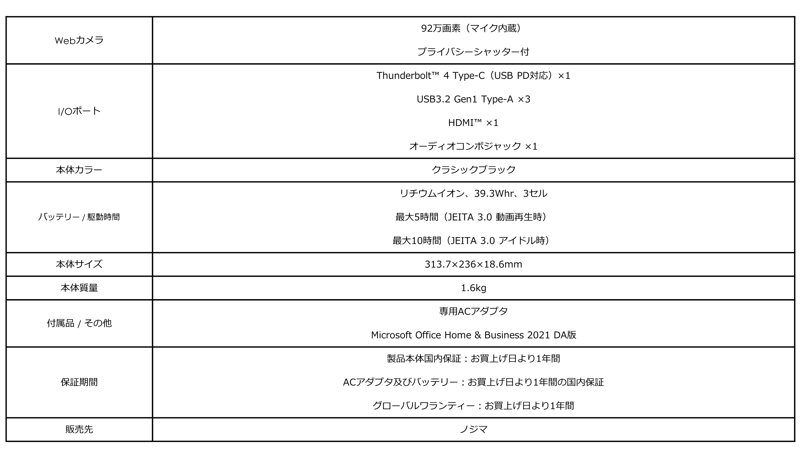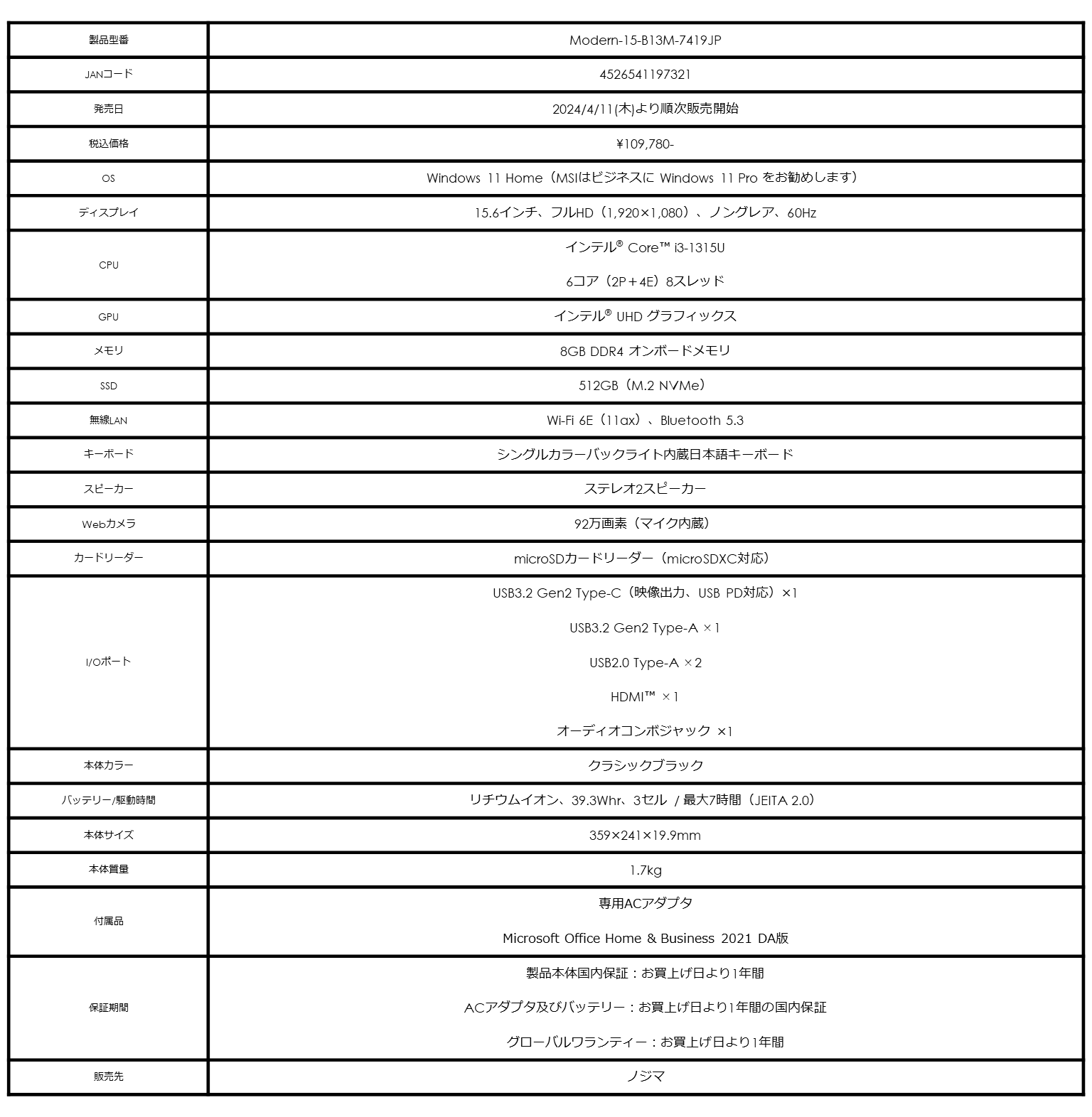 また、15.6インチビジネスノートPC「Modern 15」シリーズより、Microsoft Officeをプリインストールしつつ、CPUにCore™ i3 プロセッサーを搭載することでリーズナブルな価格を実現したノジマオリジナルモデル「Modern-15-B13M-7419JP」を4月11日(木)より発売いたします。