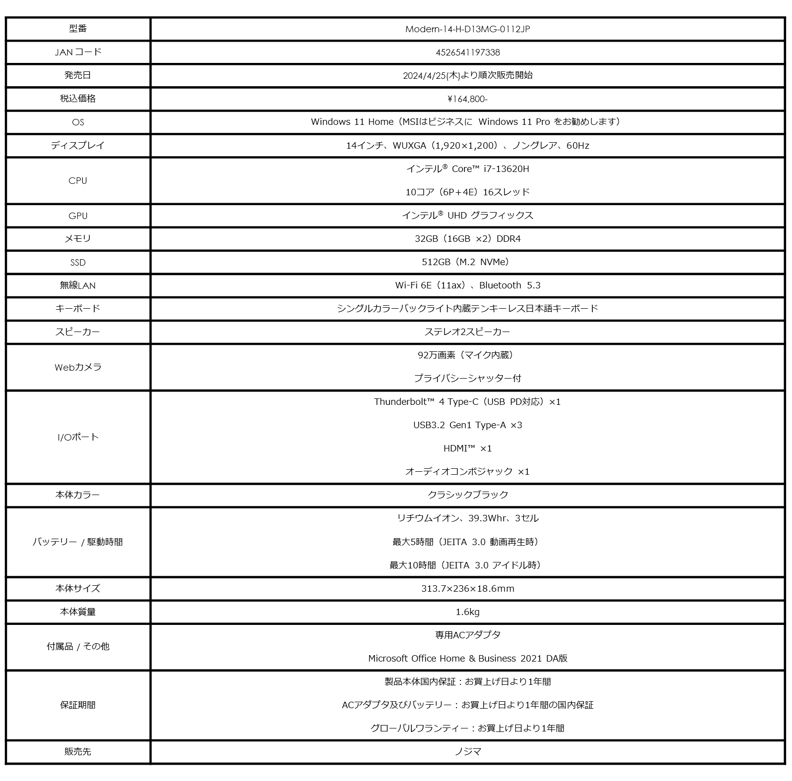 「“軽さ”ではなく“速さ”」のビジネスノートPC「Modern 14 H D13M」ノジマオリジナルモデル「Modern-14-H-D13MG-0112JP」を2024年4月25日(木)より販売開始