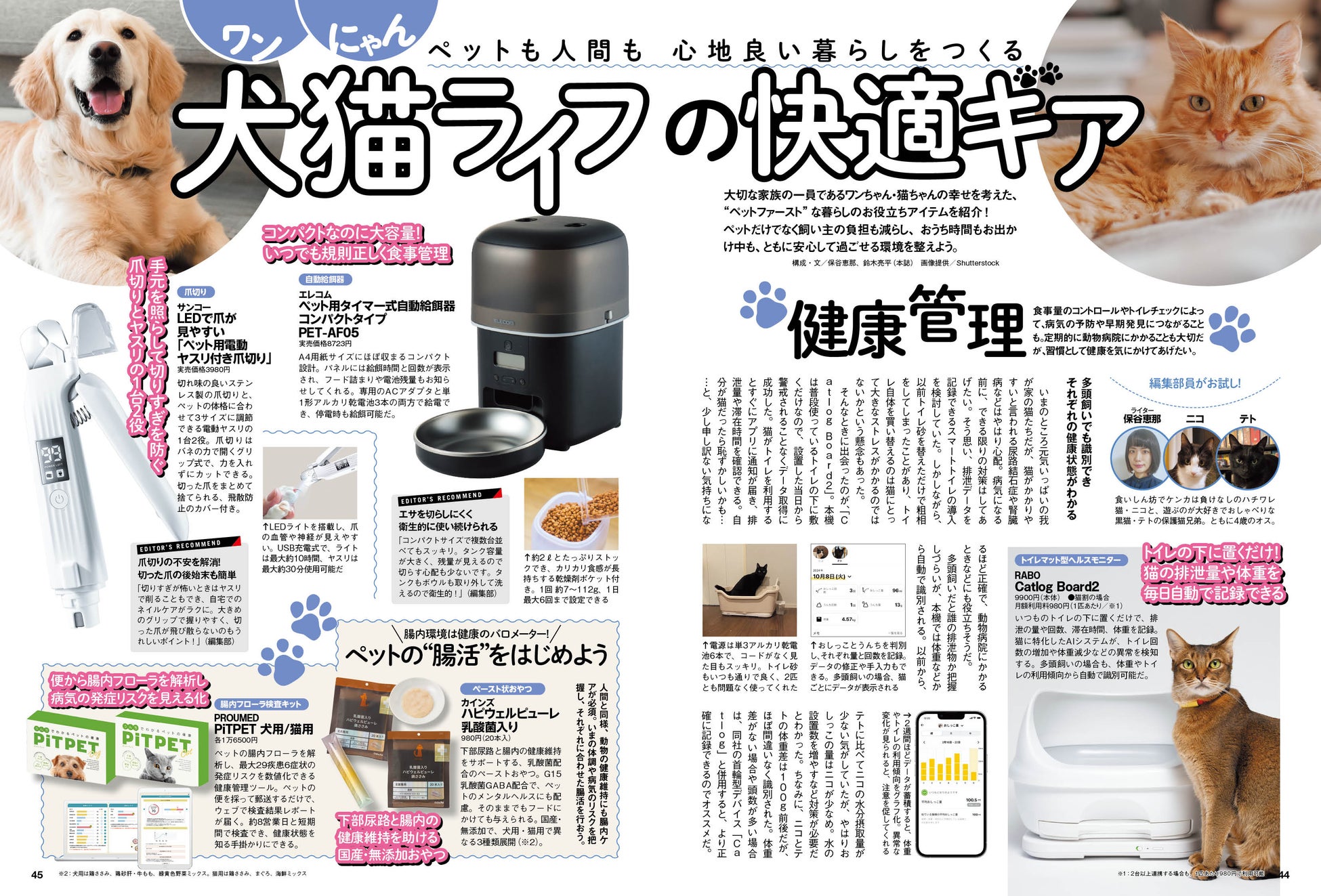 ほかにも「ペットも人間も心地よい暮らしをつくる犬猫ライフの快適ギア!」と題したペットアイテム特集を。大切な家族の一員であるワンちゃん、ネコちゃんの幸せを考えた“ペットファースト”な暮らしのお役立ちアイテムを紹介します。ペットだけではなく飼い主の負担も減らし、おうち時間もお出かけ中も、ともに安心して過ごせる環境の整えましょう。