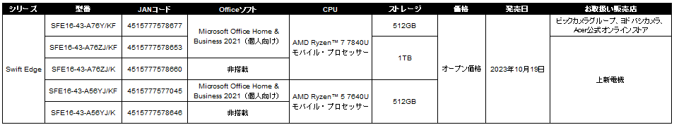 Swift Edge「SFE16-43-A76Y/KF」はビックカメラグループ、ヨドバシカメラ、Acer公式オンラインストアで2023年10月19日(木)以降順次販売します。なお、CPUやストレージ、オフィスソフトの有無などのスペック構成が異なる上新電機限定モデルも販売致します。