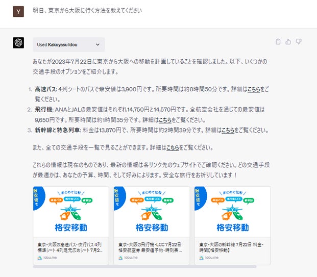 国内移動・海外航空券の価格比較サイト「格安移動」、ChatGPTプラグインの提供を開始~ChatGPTを使って日本国内の高速バス・飛行機・新幹線の価格比較ができる~
