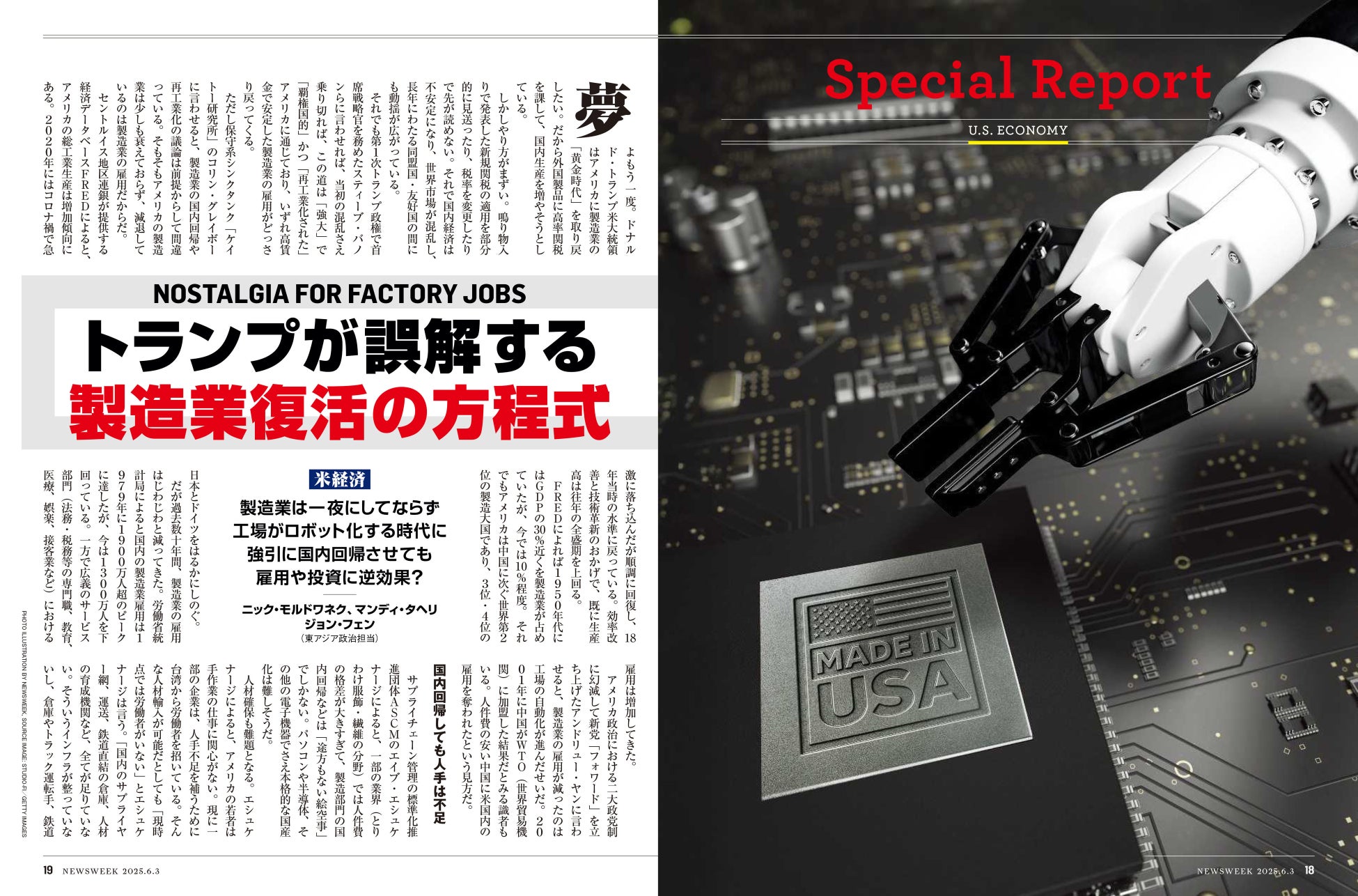 関税で「メイド・イン・アメリカ」復活を図るトランプ政権。その影響でトリプル安の恐怖も広がるアメリカの現場からの最新レポート『岐路に立つアメリカ経済』ニューズウィーク日本版6/3号は好評発売中!