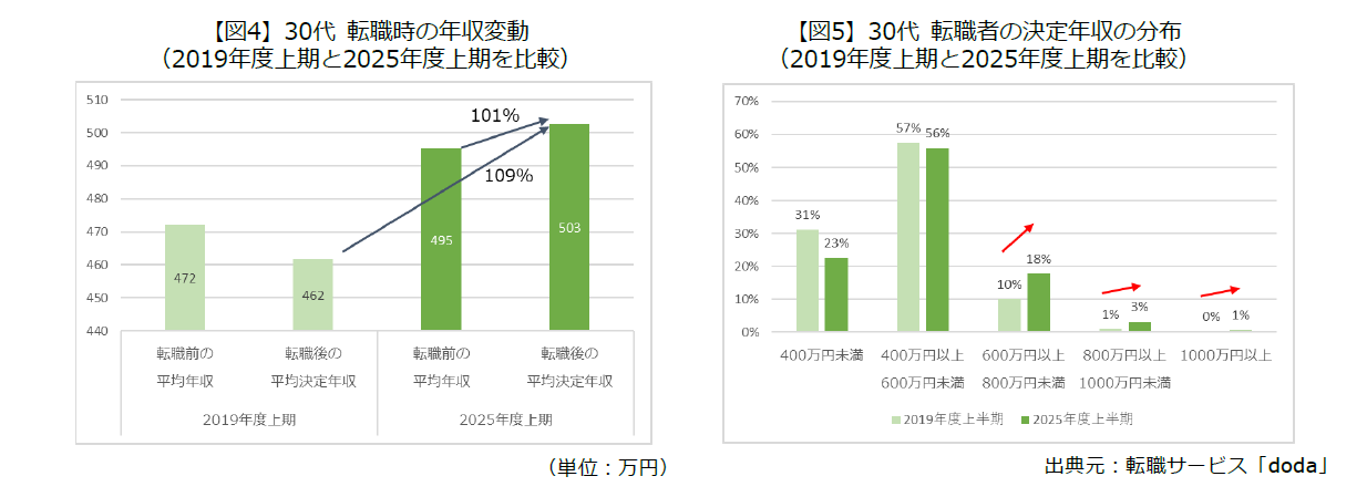 30代転職者の転職前後の年収変動をみると、2019年度上期は減少しましたが、2025年度上期は微増となりました【図4】。平均決定年収額は2019年度上期比で9%増加しています。決定年収の分布をみると、ボリュームゾーンである「400万円以上~600万円未満」の割合は変わらないものの、600万円以上の割合合計が22%となり、2019年度上期比で11%増加しました【図5】。