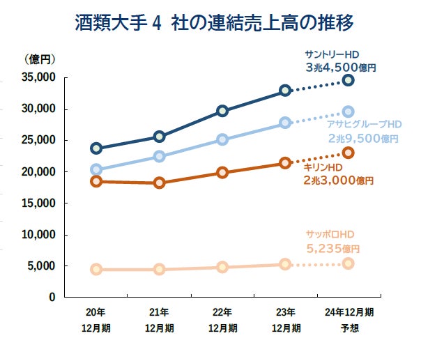 8月13日までに判明したアサヒグループホールディングス(HD)など酒類大手4社の2024年12月期(予想)の連結売上高は、4社とも前期比で増収となる見通しだ。利益面ではサントリーHD以外の3社が増益予想となる。サッポロHDの中間決算では24年4月、東京・恵比寿に「ヱビスビール」のブランド体験施設をオープンしたほか、顧客接点の拡大や新規顧客の獲得などを行ったことでビールの販売数量は前年同期比10%増となった。