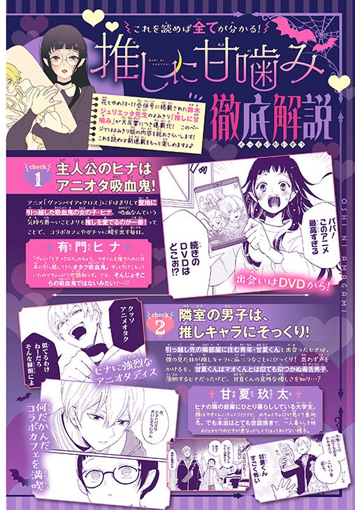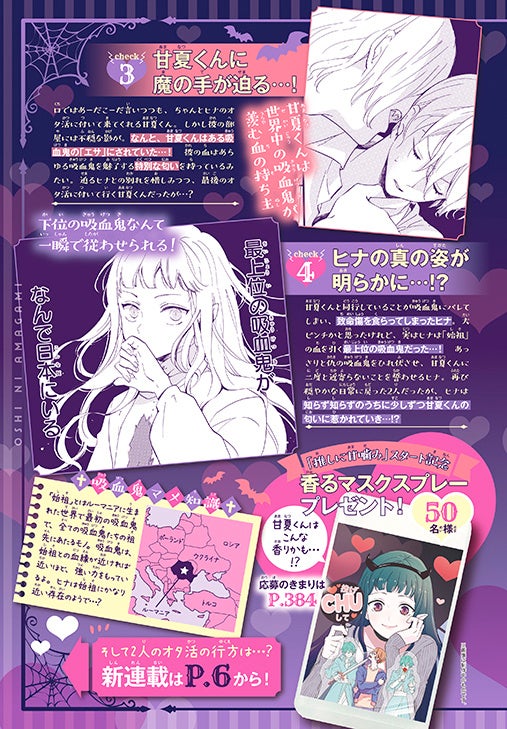 アニメ大好きな吸血鬼の女の子・ヒナと、ヒナの推しキャラにそっくりな隣人・甘夏(あまなつ)くんのラブコメディです。巻頭カラーと48ページの大ボリュームで登場します。