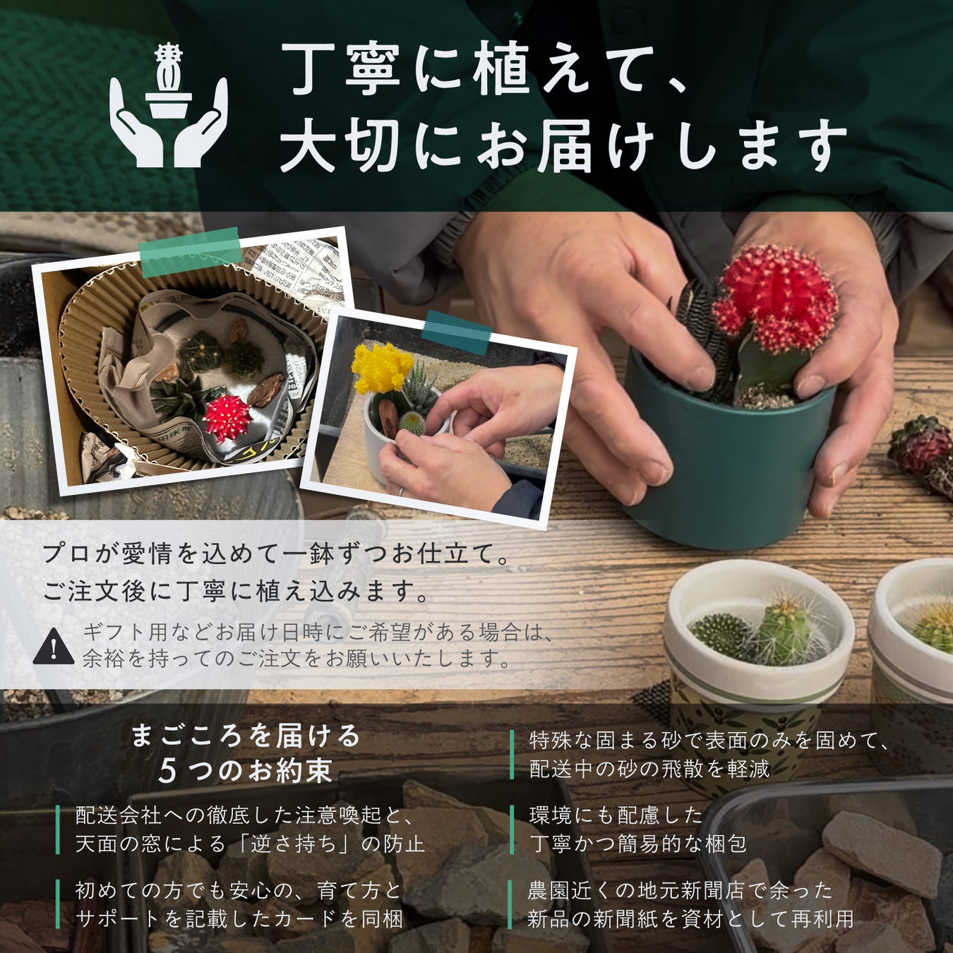 さらに、ご注文後に一鉢ずつ丁寧に植え込み、破損や崩れを防ぐ工夫を施してお届けします。